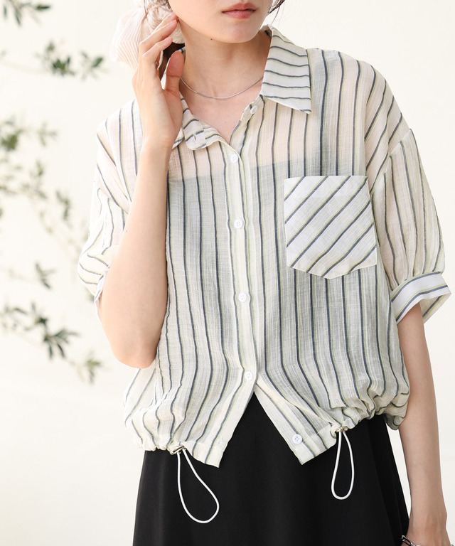 PINK H:162 着用サイズ:M BLUE H:162 着用サイズ:M NAVY H:162 着用サイズ:M トレンド感たっぷりのストライプ柄に、ドロストディテールを加えた大人カジュアルな1枚。 ウエストや裾に施されたドロストコードで、シルエットのアレンジが楽しめるデザインシャツです。 ゆったりとしたサイズ感ながら、ウエストをキュッと絞ればメリハリのある女性らしいシルエットに。爽やかなストライプ柄がコーデに清涼感をプラスし、春夏らしい軽やかなスタイリングを叶えます。 フロントを開けて羽織りとしても使えるので、Tシャツやタンクトップにさっと重ねるだけでこなれ感◎ ハイウエストパンツに合わせて脚長効果も◎ ウエストを絞って、ワイドパンツやロングスカートとバランス良く・裾をゆるめて、抜け感たっぷりのルーズスタイルに着るのがおすすめ。