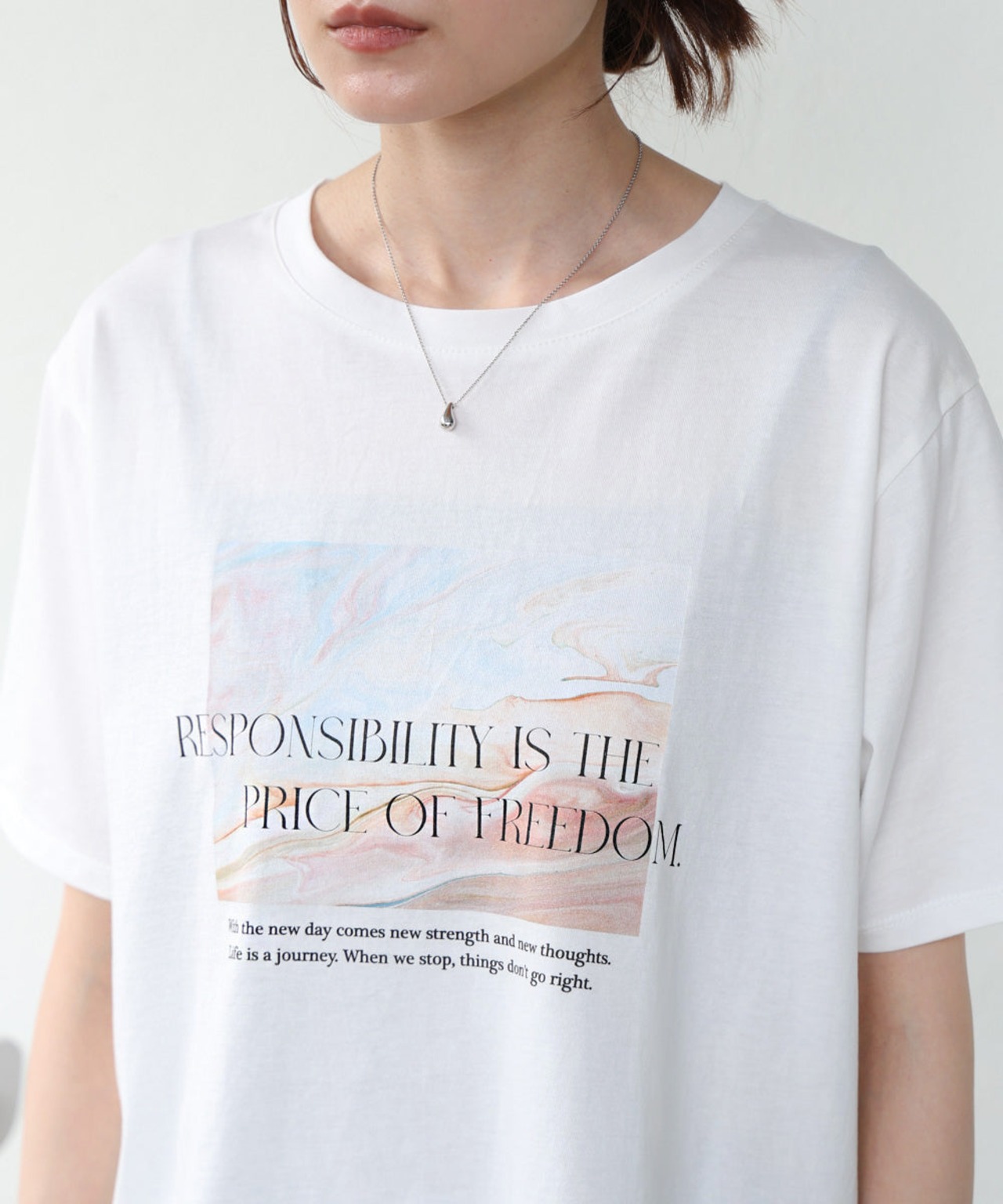ニュアンス感たっぷりのインクジェットプリントを背景にシンプルなロゴデザインが映えるTシャツ登場!程よいゆとりのあるサイジングと大人の女性らしさもあるプリントで大人カジュアルなスタイルが叶います。洗っても色落ちしにくく長く愛用できるのも嬉しいポイント。