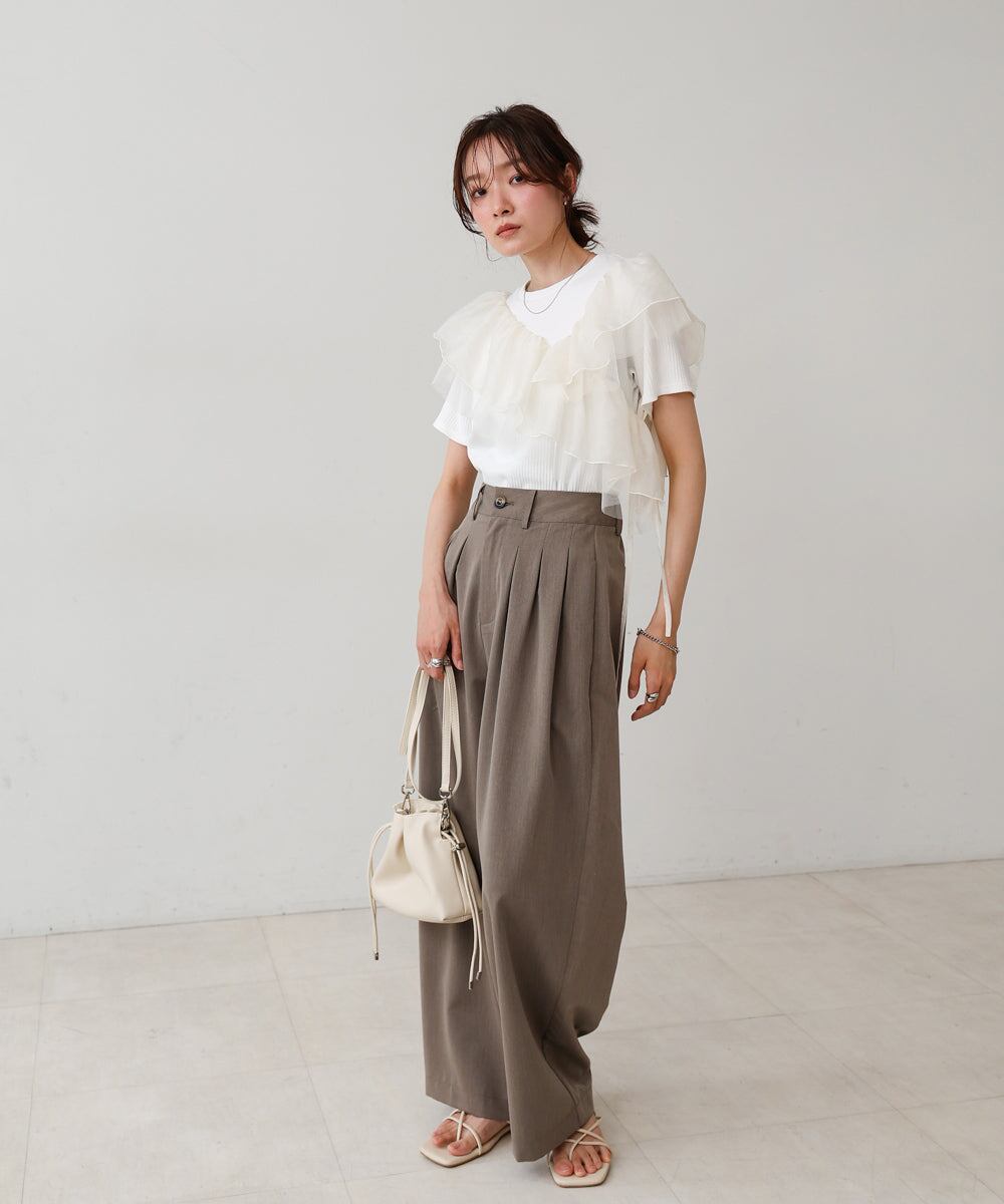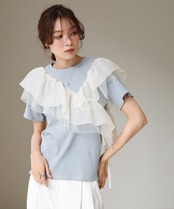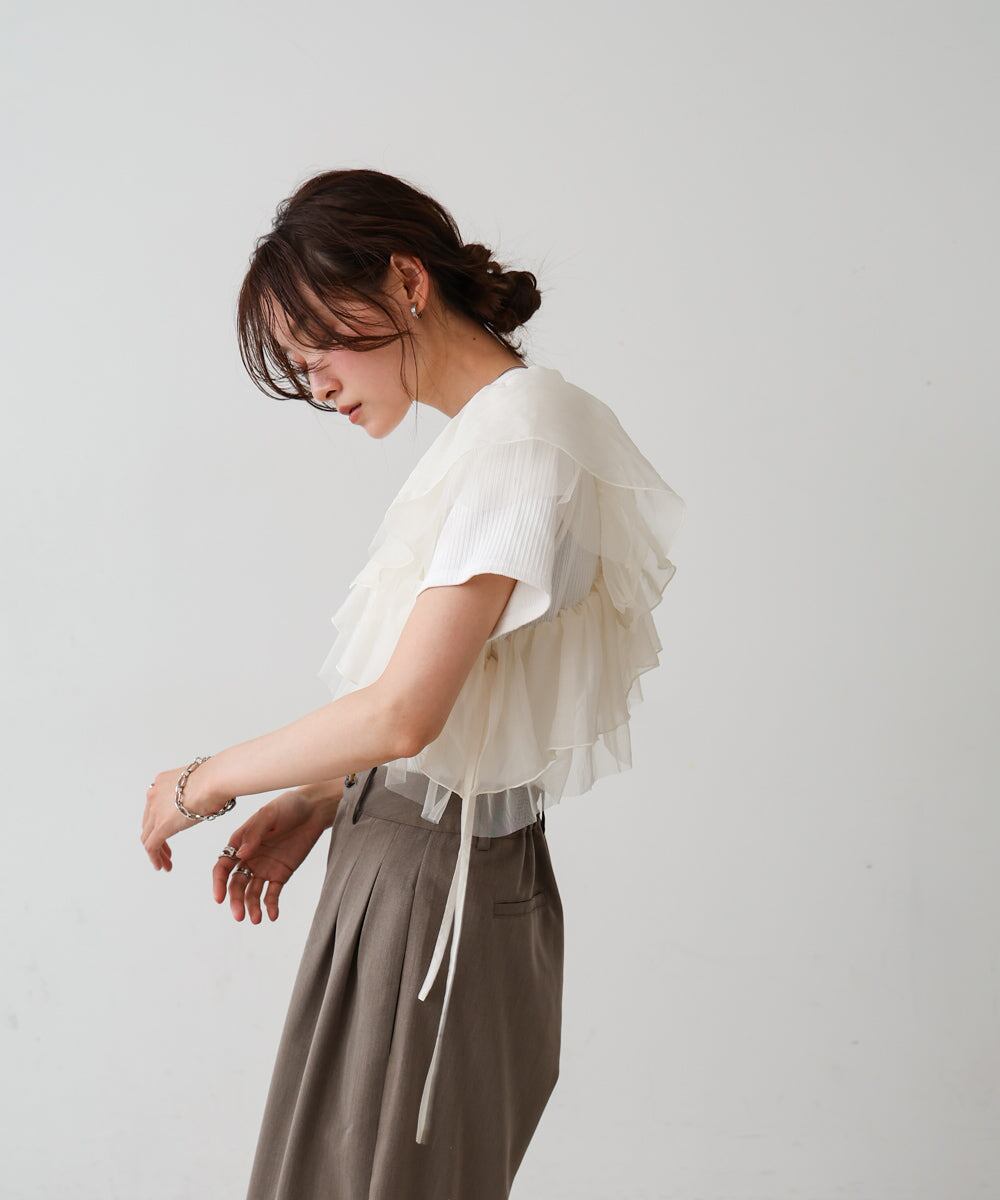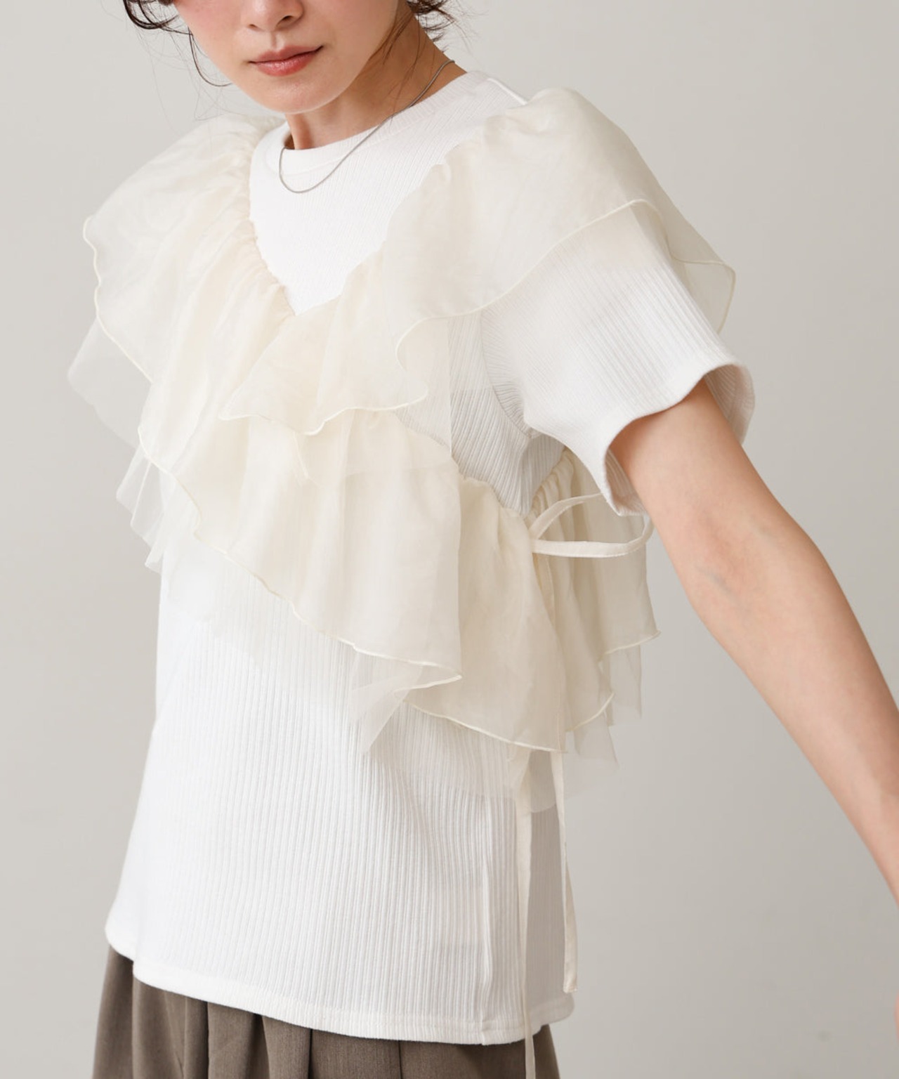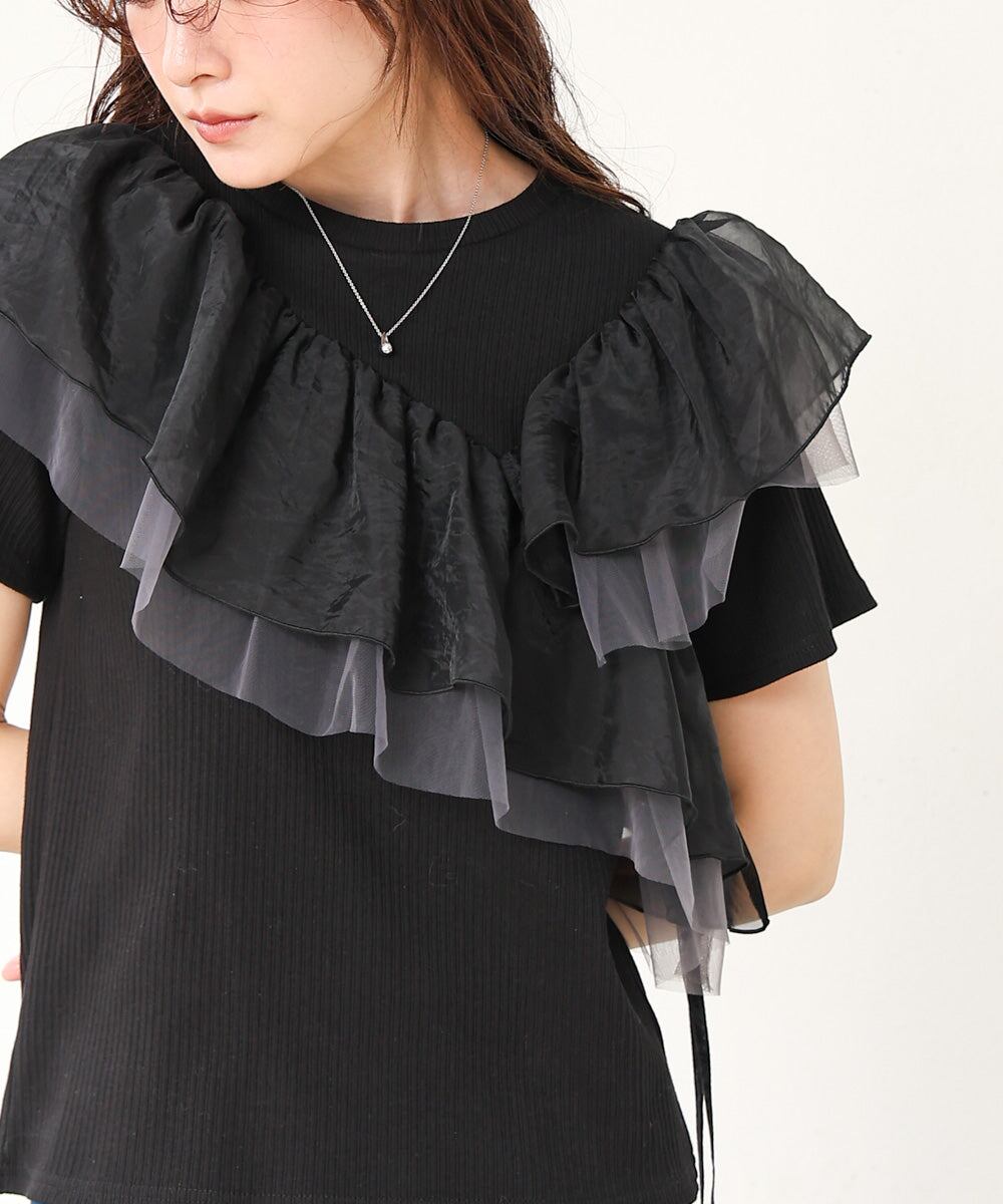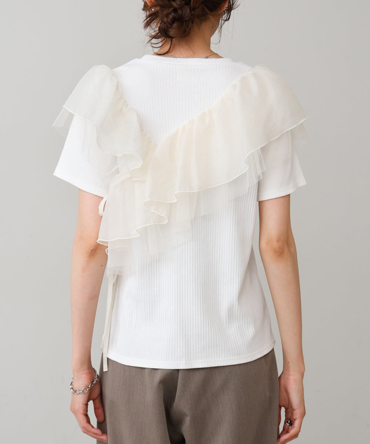 シンプルなリブカットソーにトレンドのフリルデザインをドッキングさせた 着映え抜群のトップスです。フリル部分はオーガンジーとチュールの2枚仕立てでフェミニンさ際立つボリューム感があり、アシンメトリーのディティールでこなれ感も演出できます。