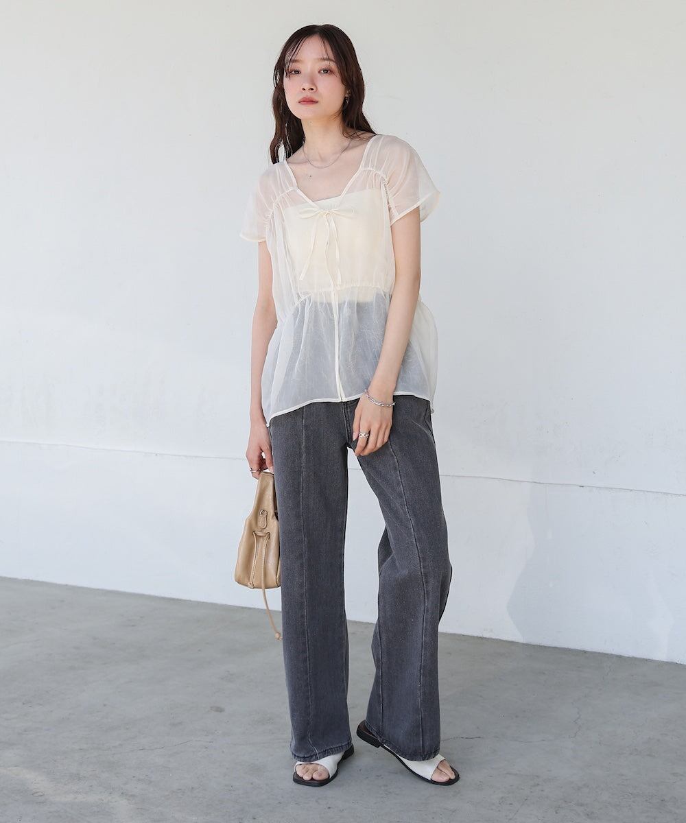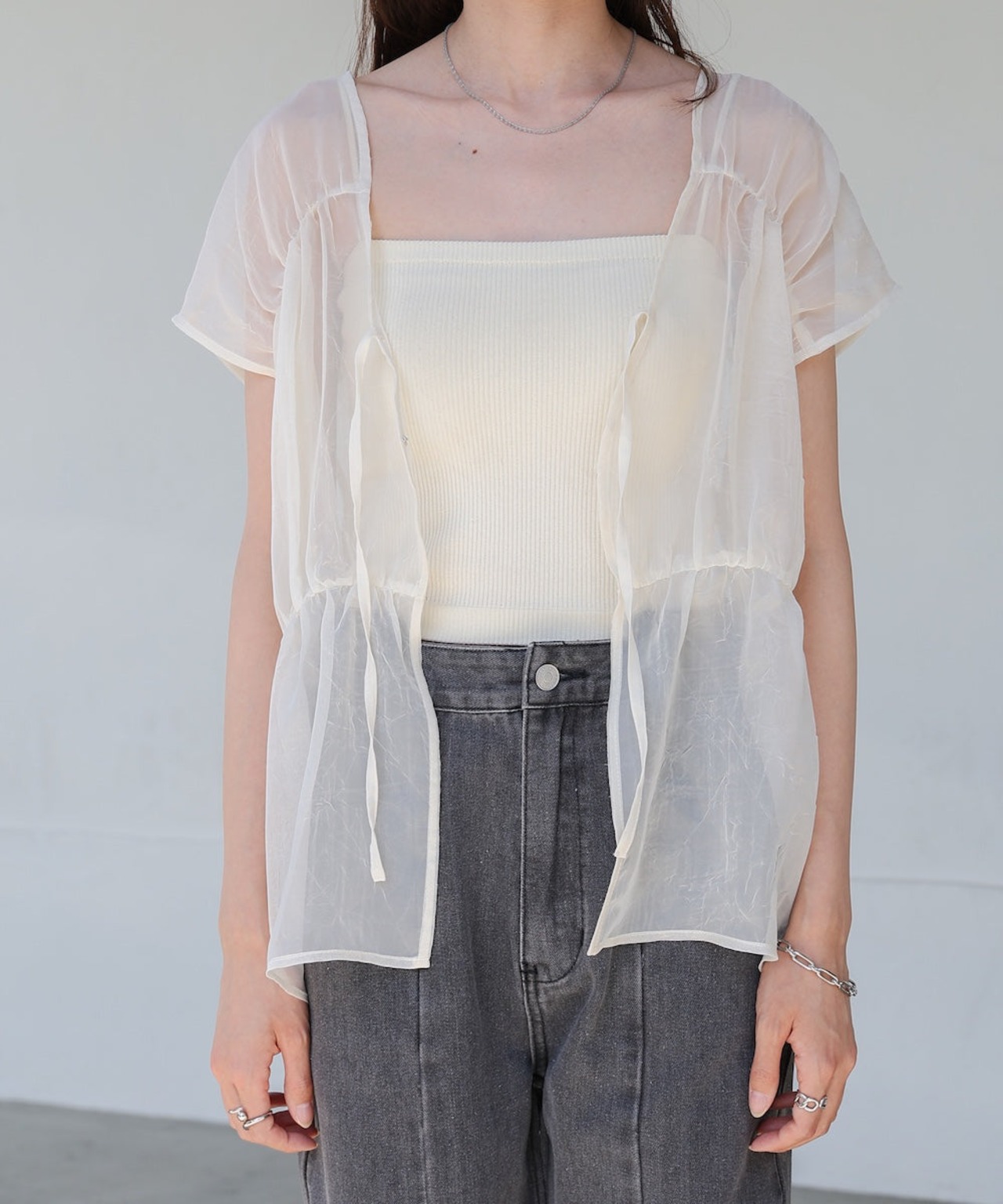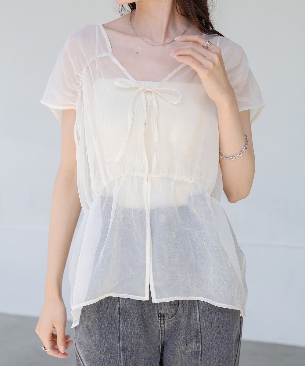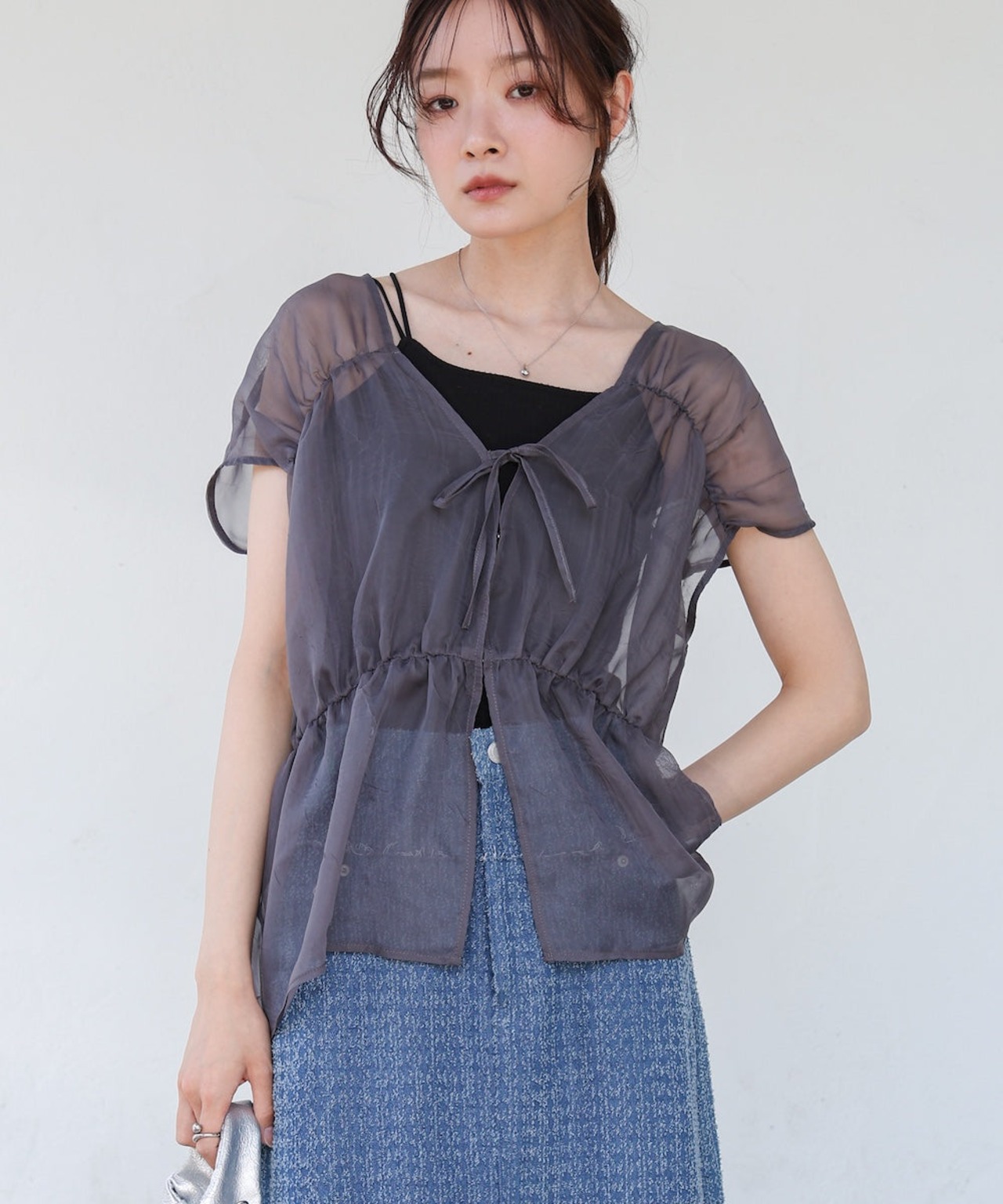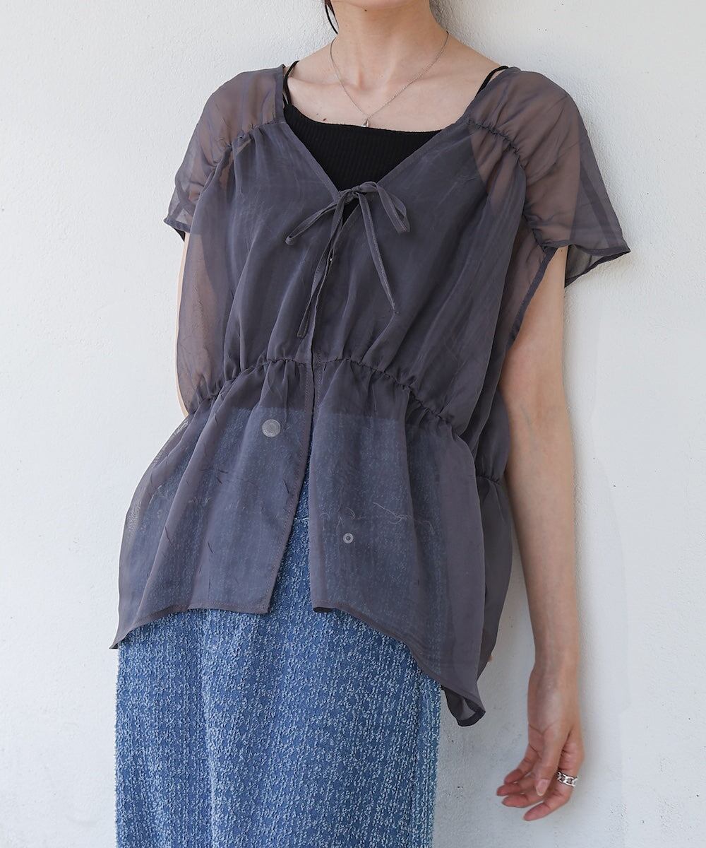 昨年も大人気だったシアーブラウスが新カラーでアップデート!前後2WAYで気分に合わせて着用頂けます。シワ加工したオーガンジー素材を使用し、立体感より出るような素材をチョイス。たっぷりギャザーを寄せた仕様も女性らしい印象に。フロント部分のリボンは結んでも垂らしても◎。リボン結びだとより可愛らしい見た目に。気になる二の腕部分も自然と隠してくれるので、キャミソール系のアイテムの羽織にぴったりです。
