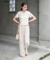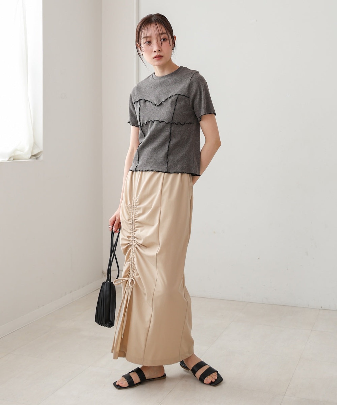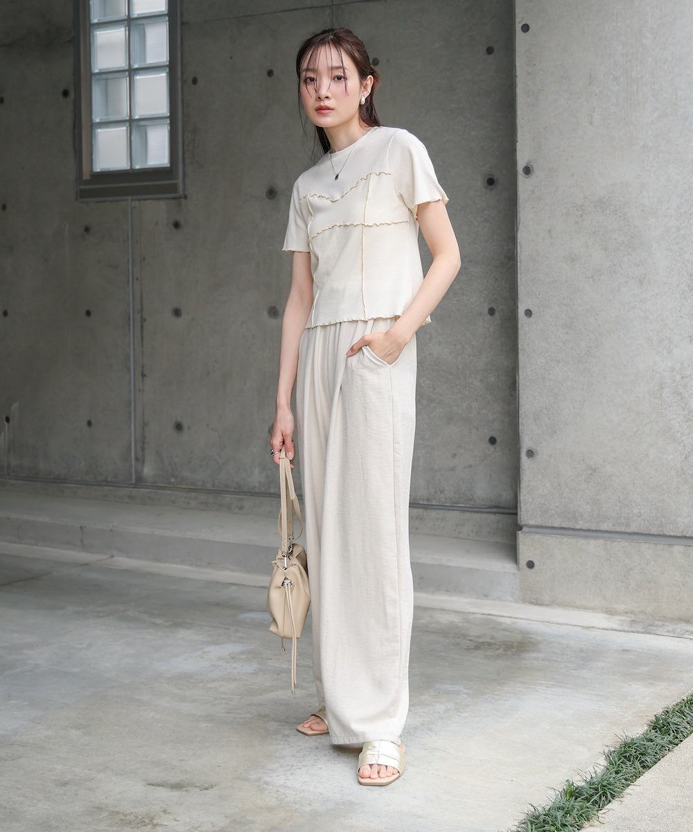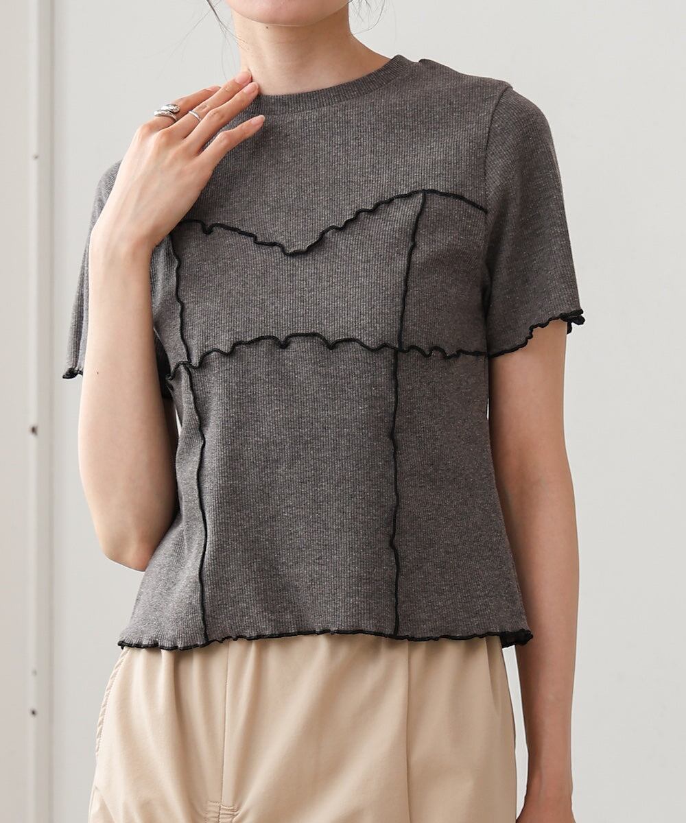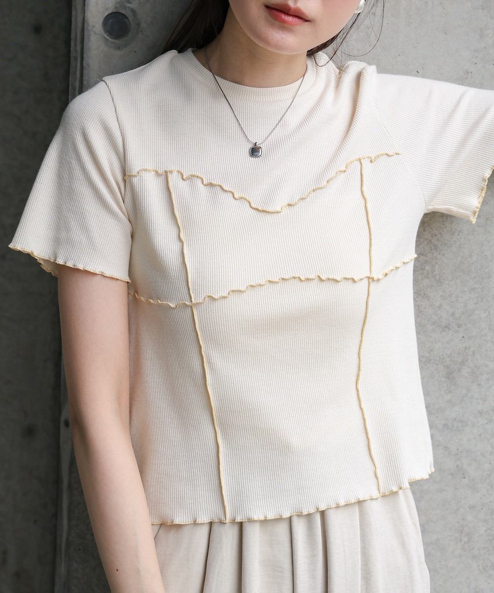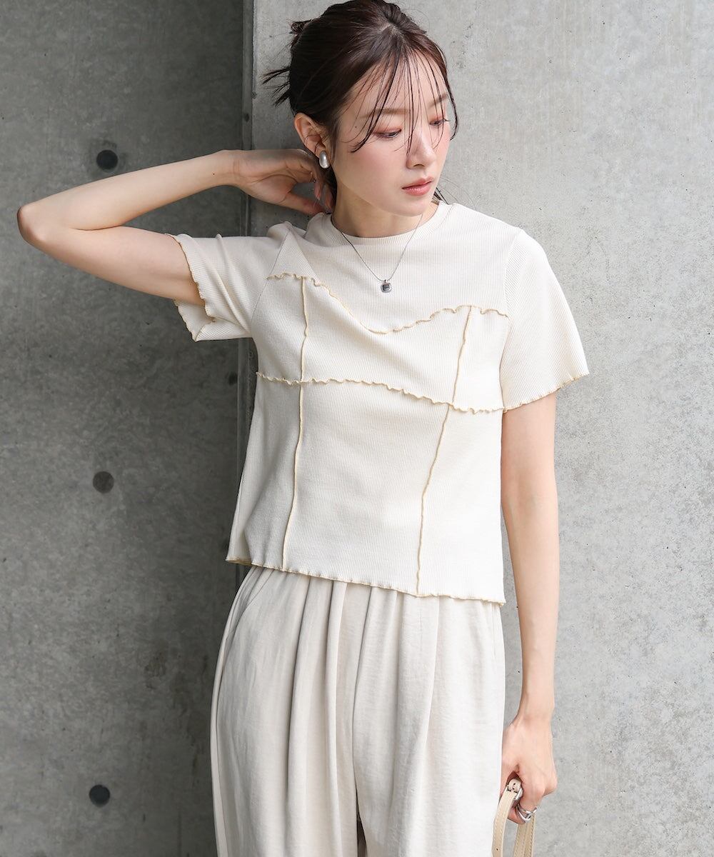 ビスチェ風のメロウ切り替えデザインが特徴で、一枚でレイヤード風の着こなしが楽しめるアイテムの登場です。配色のメロウステッチがアクセントになっていて、シンプルなのに存在感があり、着るだけでこなれ感を演出できます。ほどよくフィットするシルエットで、女性らしさもありつつ、着心地も抜群です。デザインに存在感があるので、ボトムはシンプルにまとめるのが◎。
