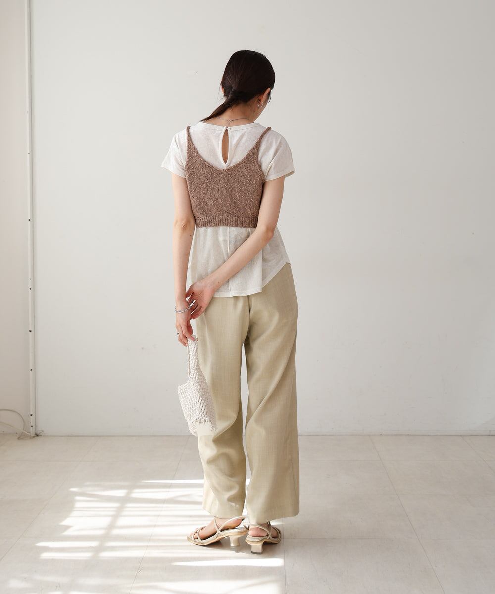 ウエストに視線を集めるデザインなのでスタイルアップ効果もあり、メリハリのあるシルエットを作ることができます。ざっくりとした編み地の表面感で夏らしい涼しげなアイテムに仕上がりました。