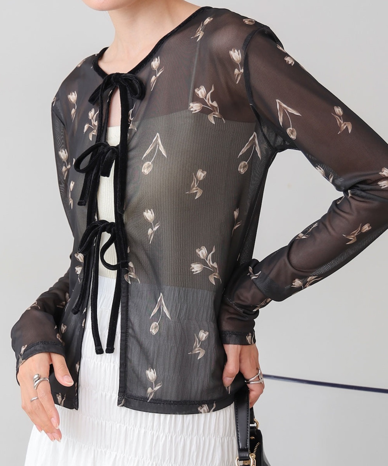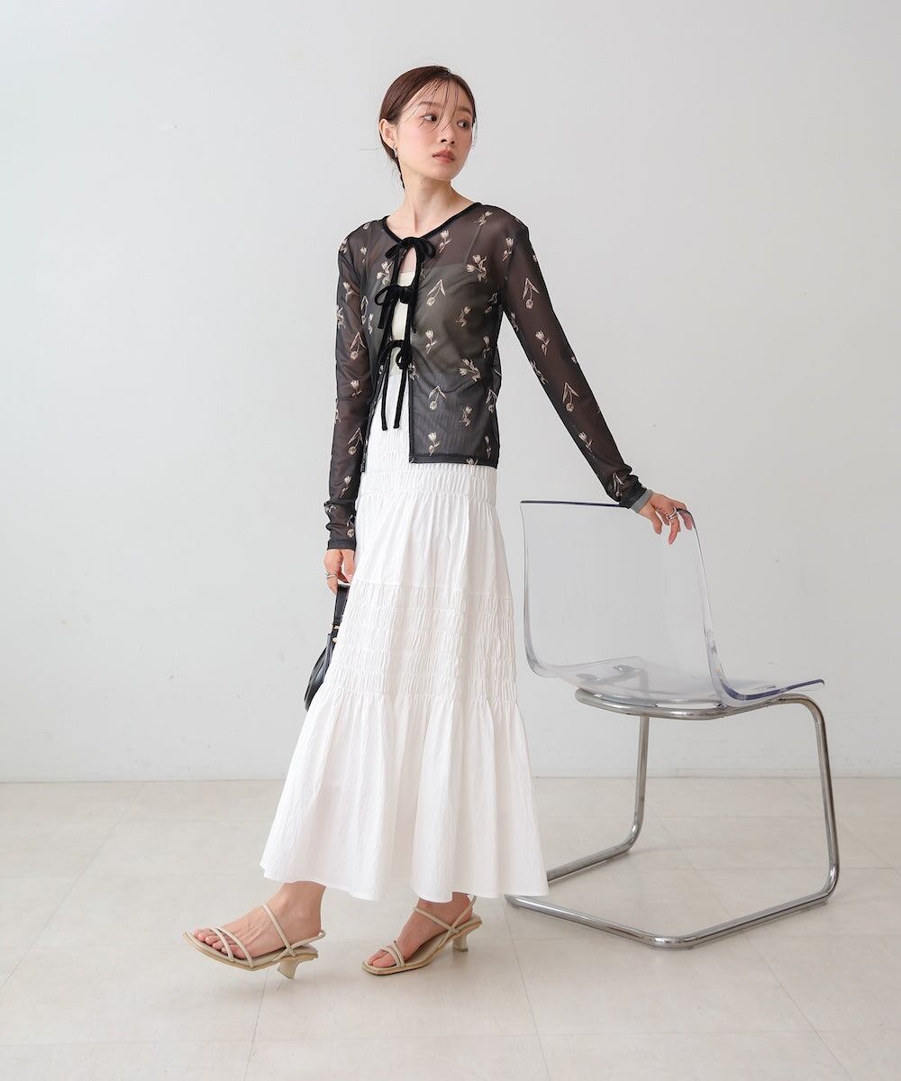 リボンもアクセントになり、シアー素材で涼しげな印象をプラス。