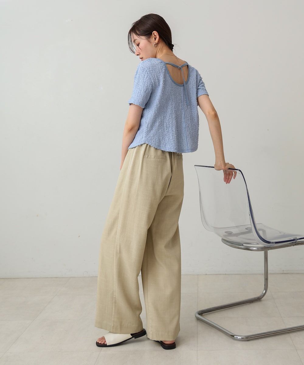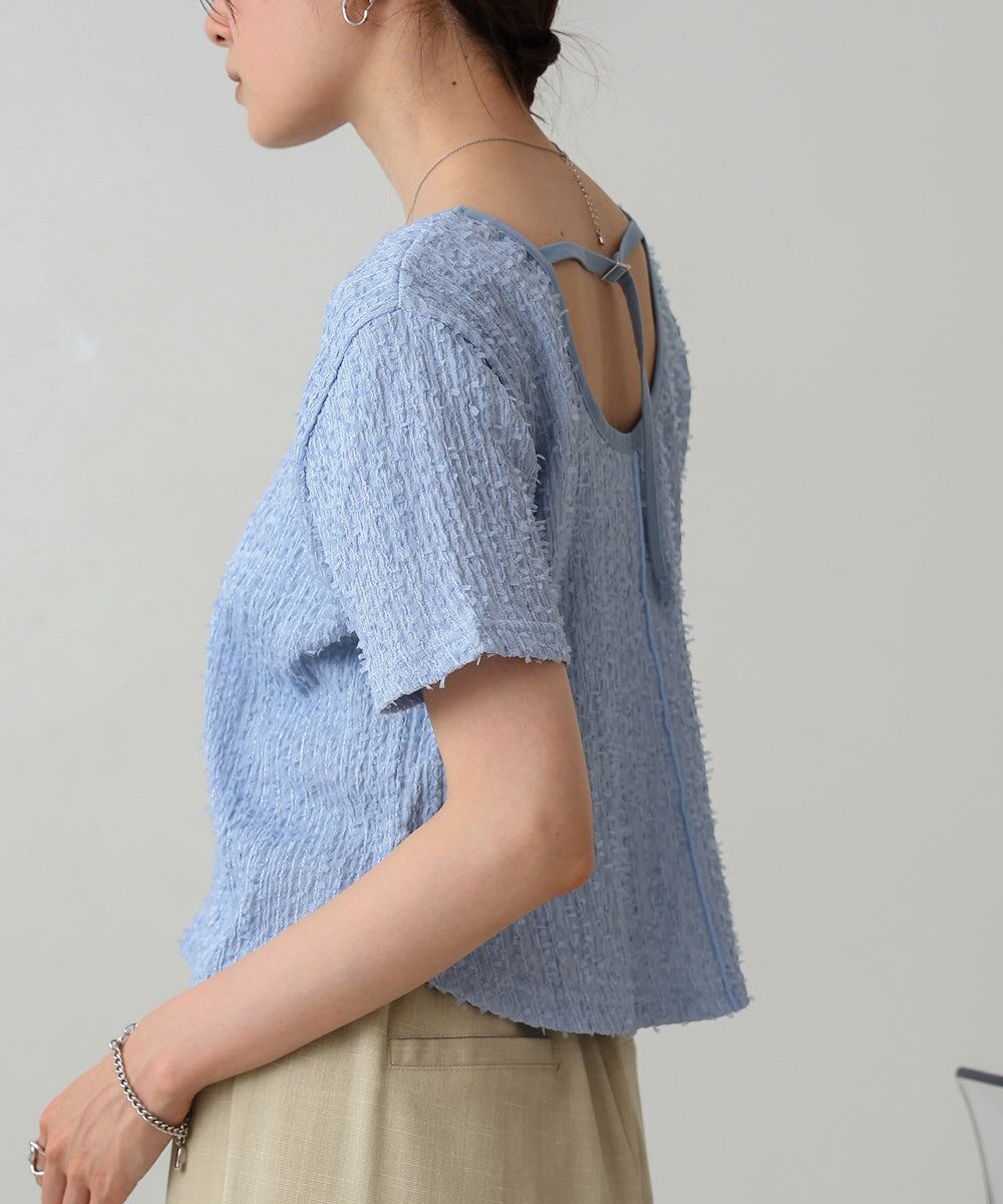 パイピングのアクセントがシンプルなデザインに華やかさを加え、シャギー素材の表面感がふわっとしたナチュラルな印象を感じさせます。カットトップスなのでリラックス感があり、ボトムスとも合わせやすく、カジュアルにもキレイめにも着こなせる万能アイテムです。