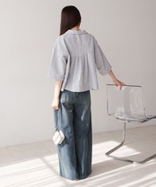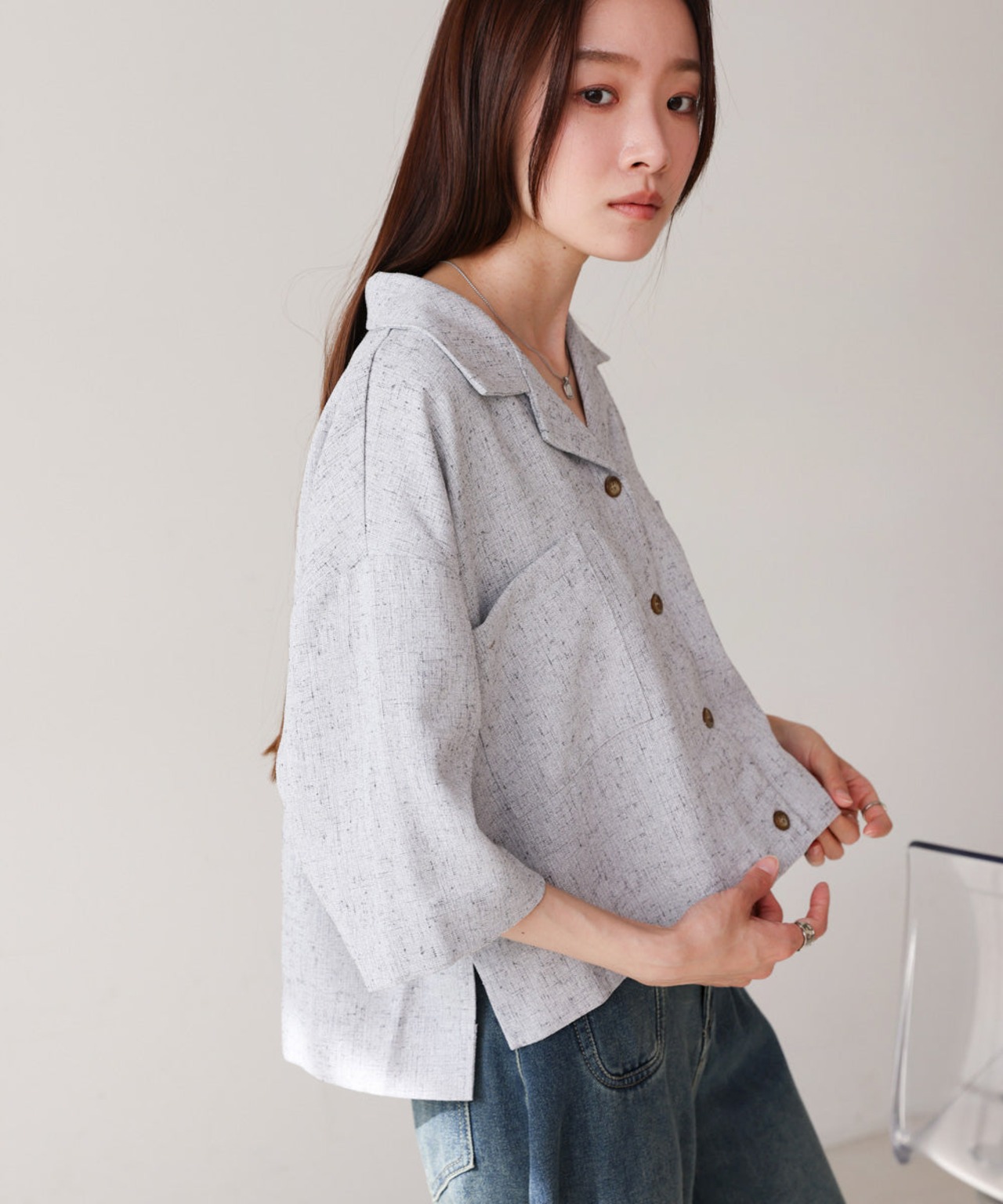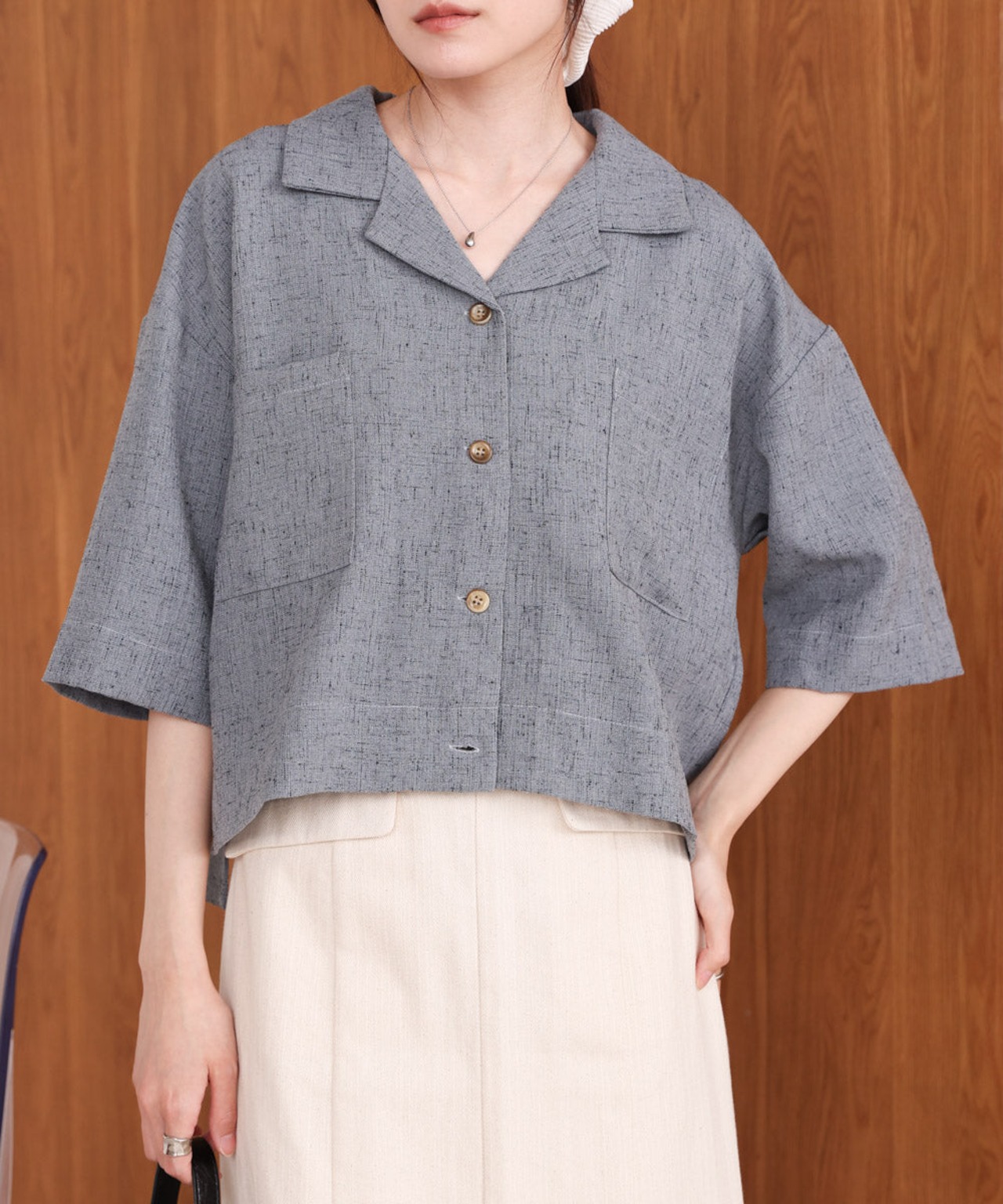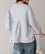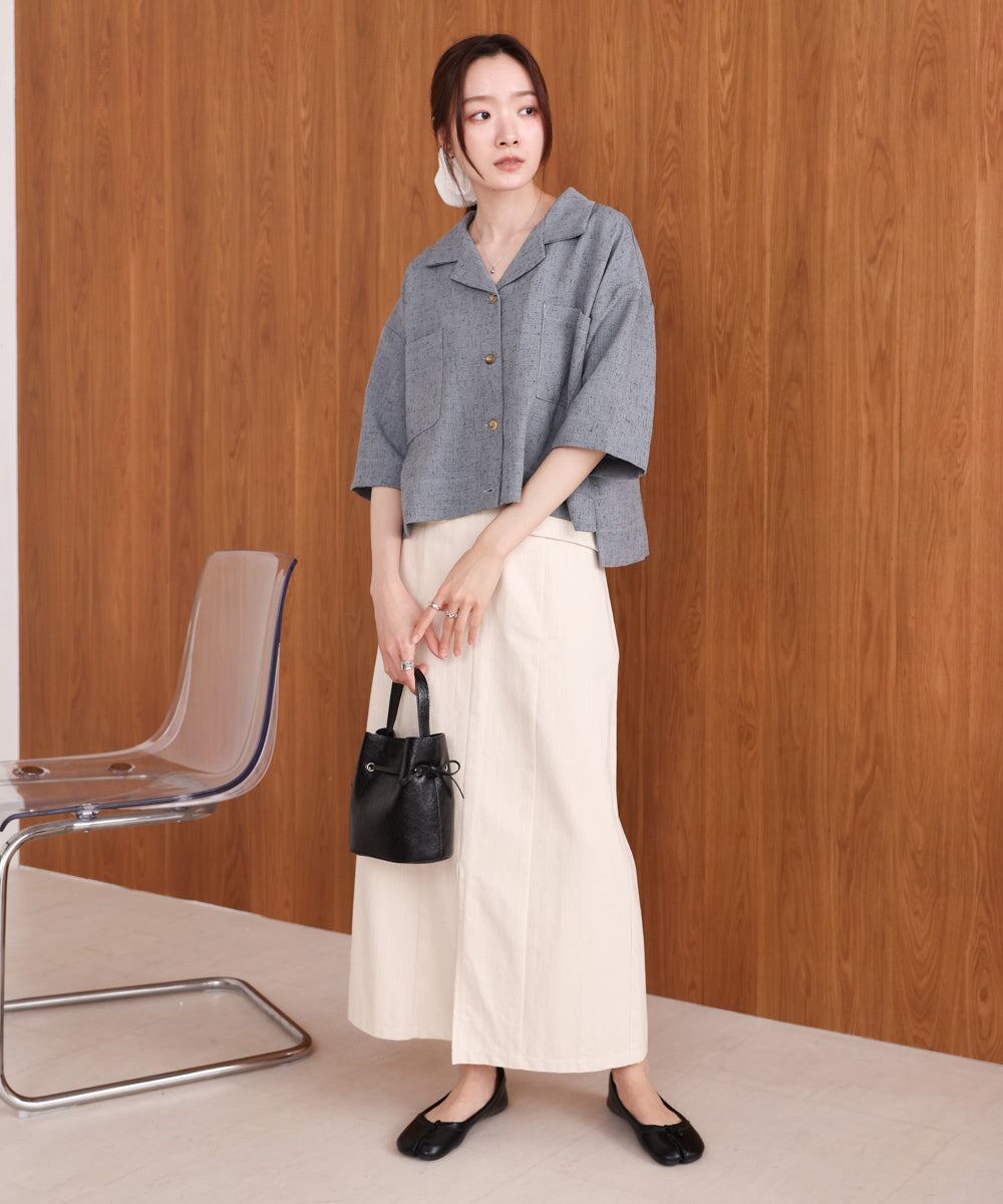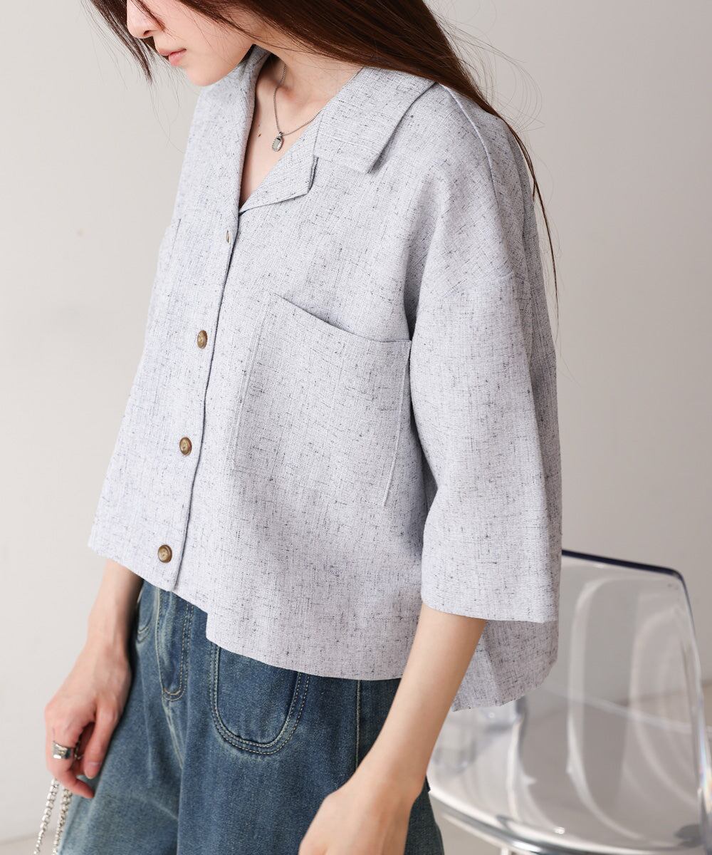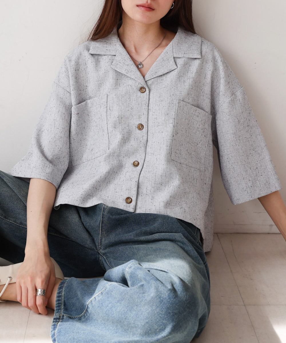 自然体なムードを楽しめるオープンカラーシャツが、抜け感たっぷりのハーフスリーブで登場しました!短めの着丈でウエストの華奢見えも期待できます。背中のタックでシルエットに丸みを持たせ、メンズライクに寄りすぎず 可愛らしさも抜かりなく演出。フロントに大胆にあしらったスクエアタイプのポケットもアイキャッチになります。