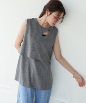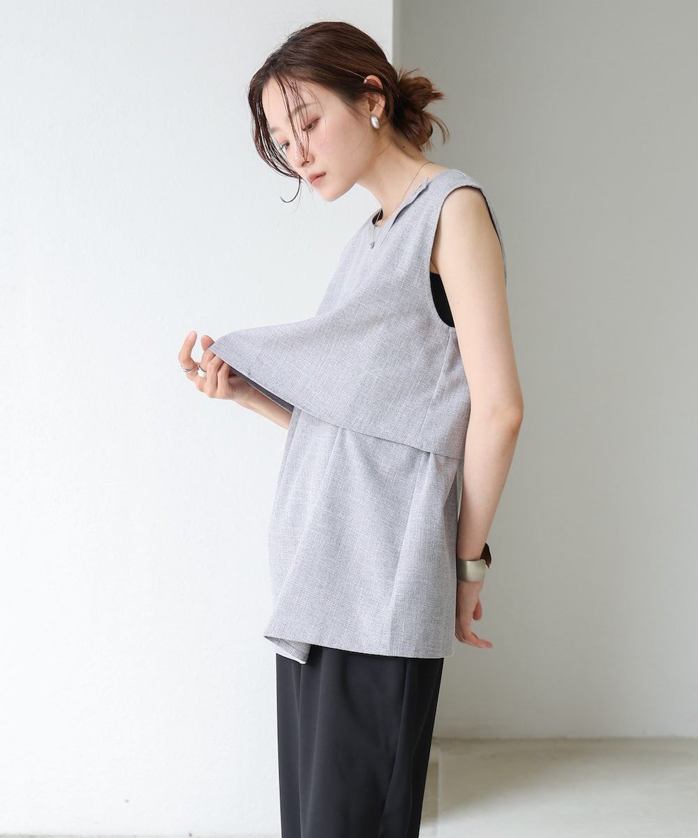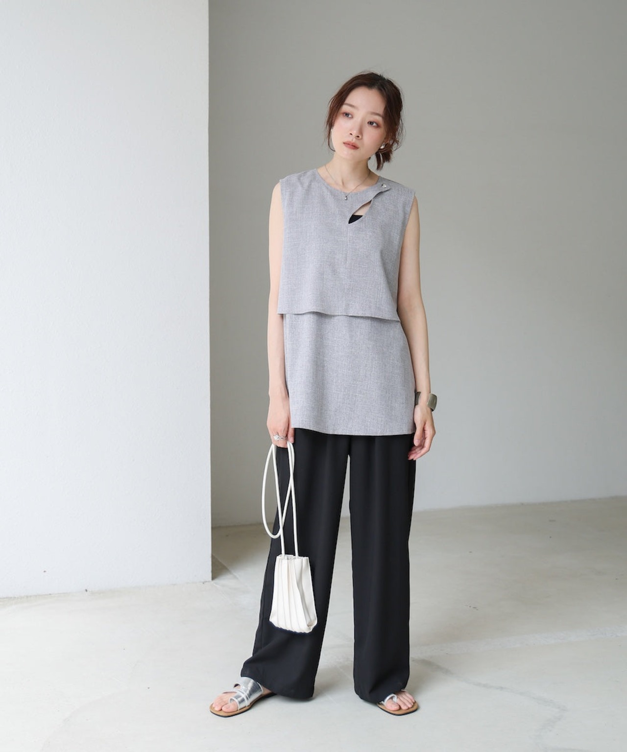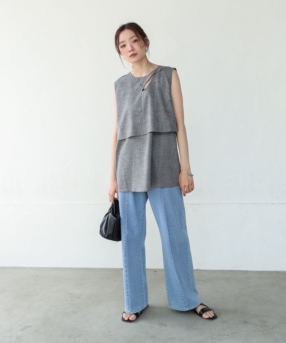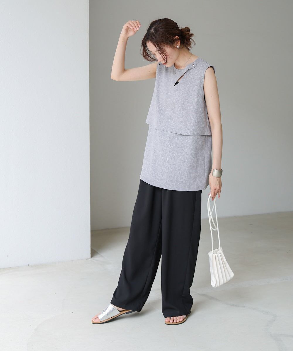 まるで重ね着しているようなディテールで、シンプルなのにおしゃれ見えが叶うアイテムです。ふんわり広がるシルエットと、ほどよい抜け感のあるノースリーブが、女性らしさを引き立ててくれます。