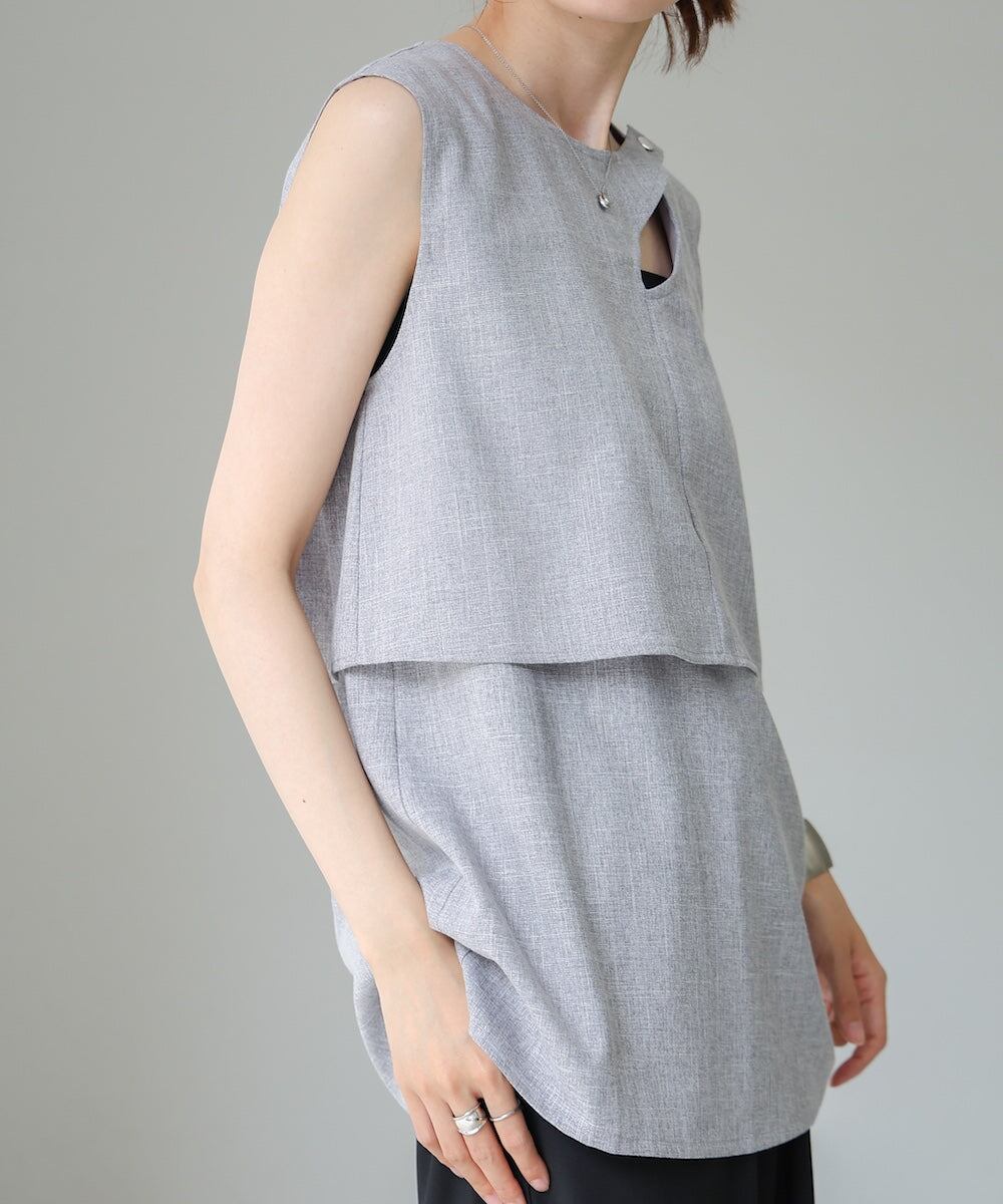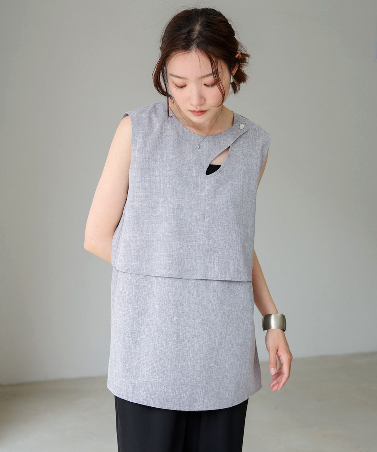 首元のしずくのようなデザインが目を惹く、1枚でサマになるレイヤード風デザインのノースリーブブラウス。