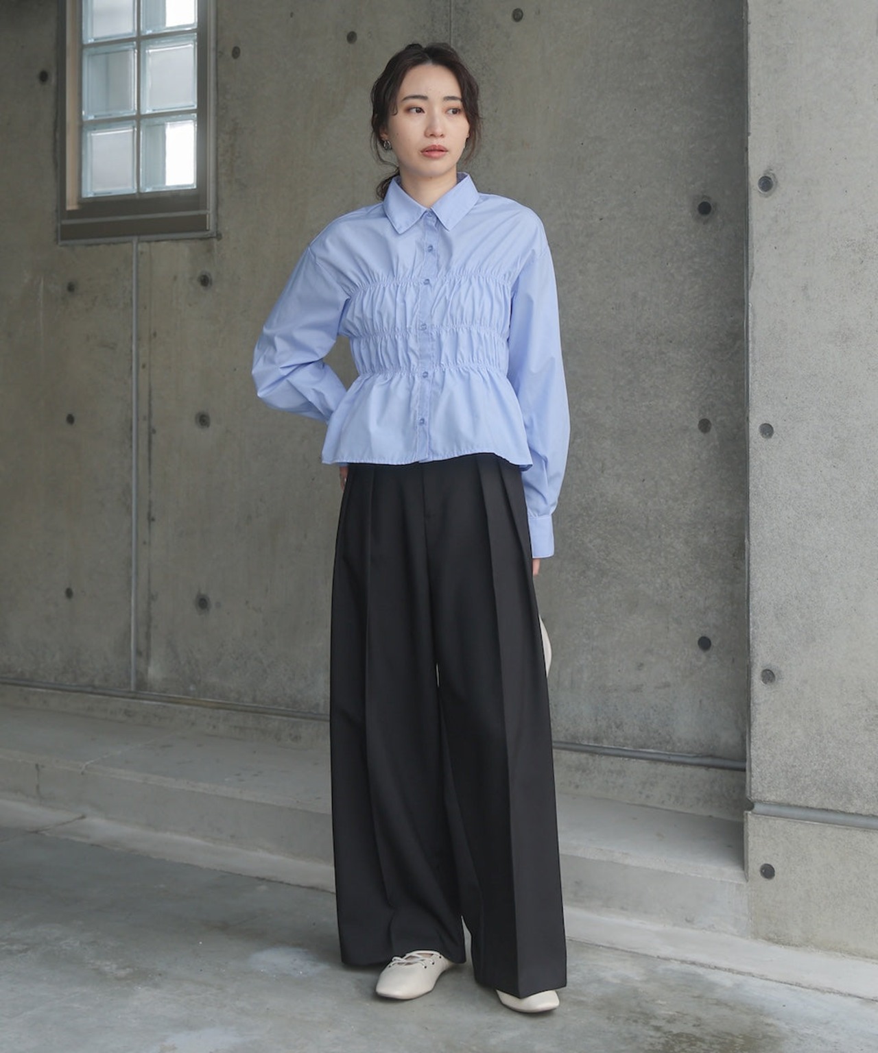 幅広いテイストが楽しめるビスチェデザインのシャツです。ギャザーデザインが程よくフィットしたシルエットに。1枚でコーデが完成するデザインシャツです。袖口はつまり過ぎず、程よいワイドシルエットで抜け感がでてカジュアルにまとまります◎