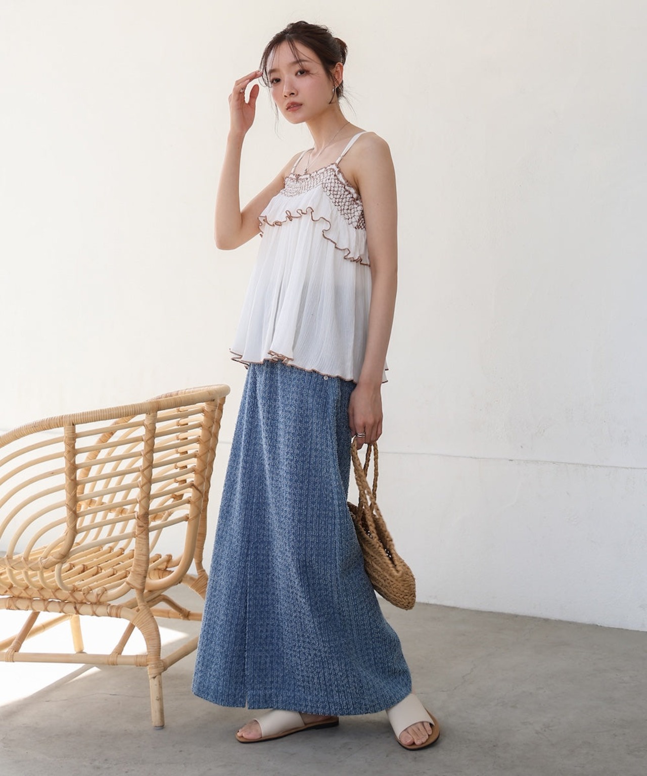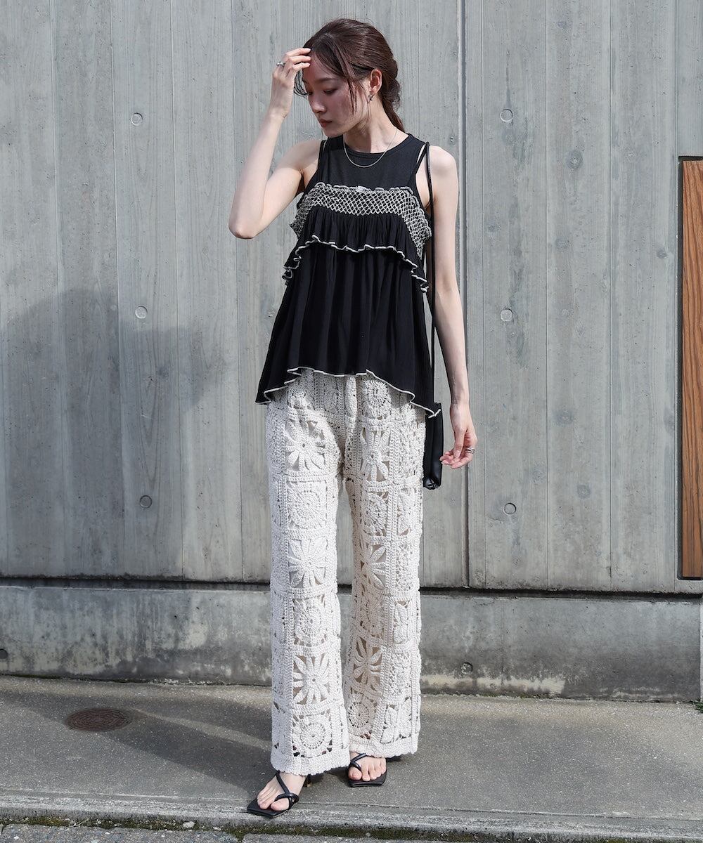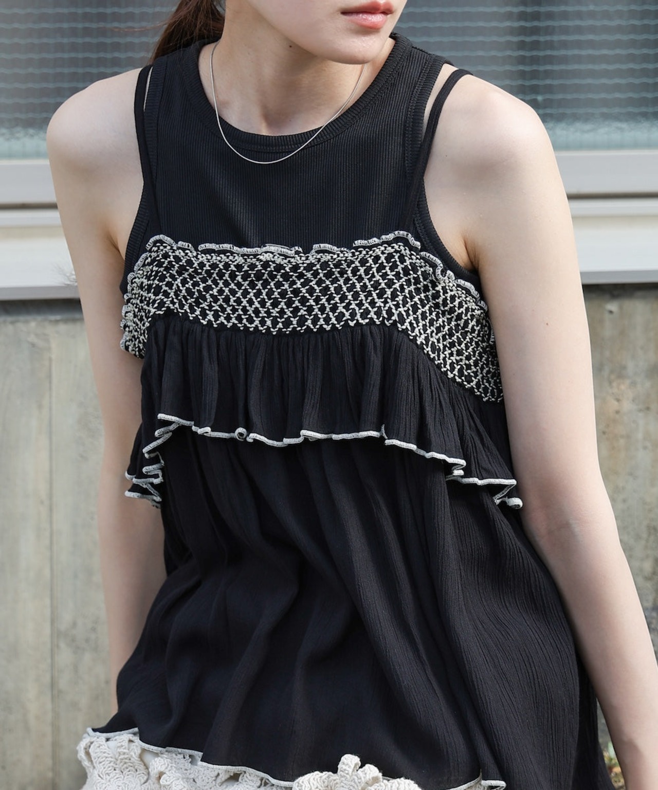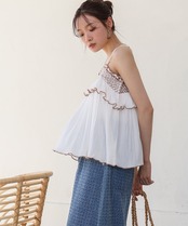しわや凹凸感が特徴のクレープ生地を使用したキャミソール。胸元にあしらったスモッキング刺繍が顔周りを華やかにしてくれます。前後差のある丈感でティアードになっているのでウエスト周り、お尻周りもカバーしてくれます。トップスとしてもレイヤードとしても着回しの効くうれしいアイテムです。