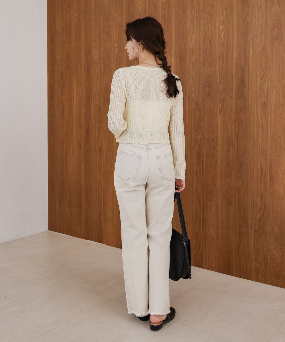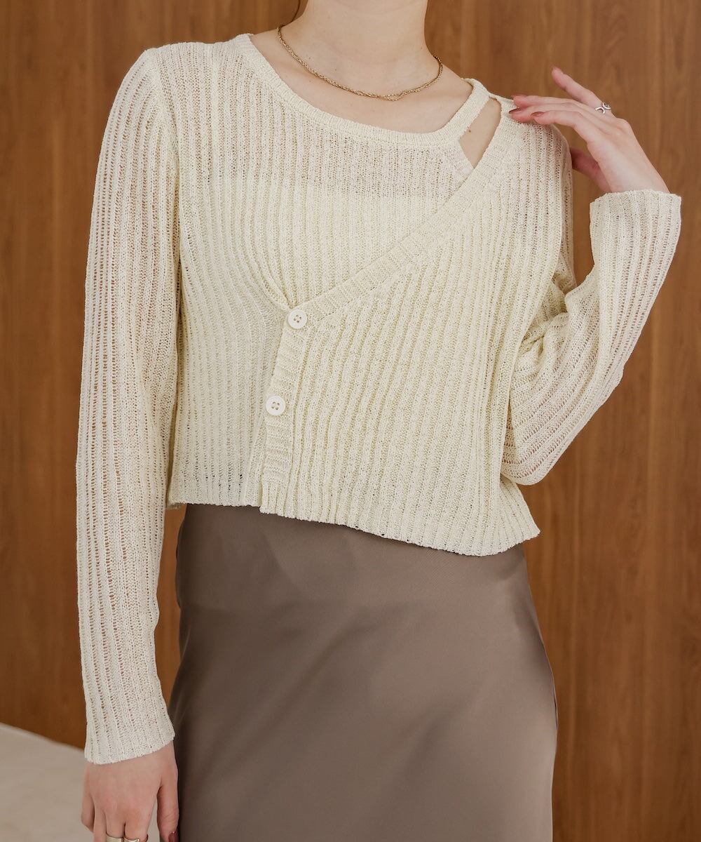 ざっくりと編まれたリブ編みはシアー感を演出し、左肩の控えめな肌見せはヘルシーで女性らしい雰囲気をプラスしてくれます。