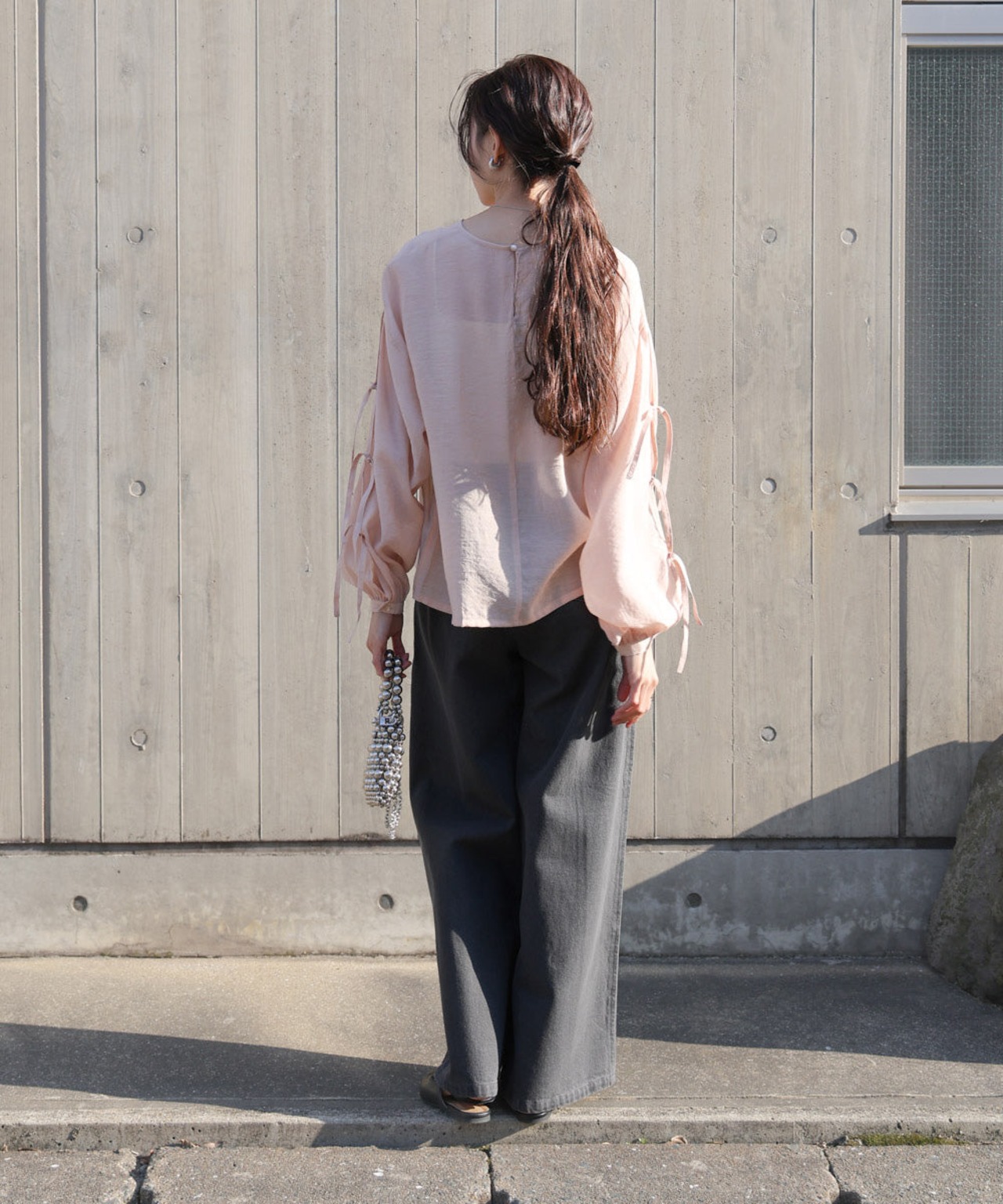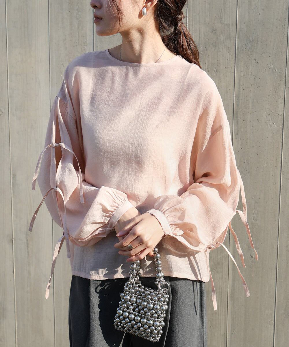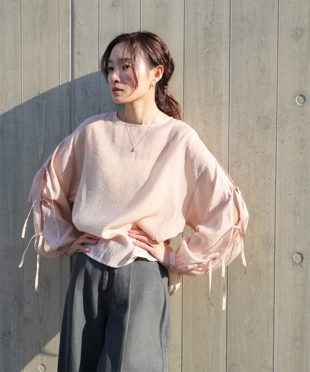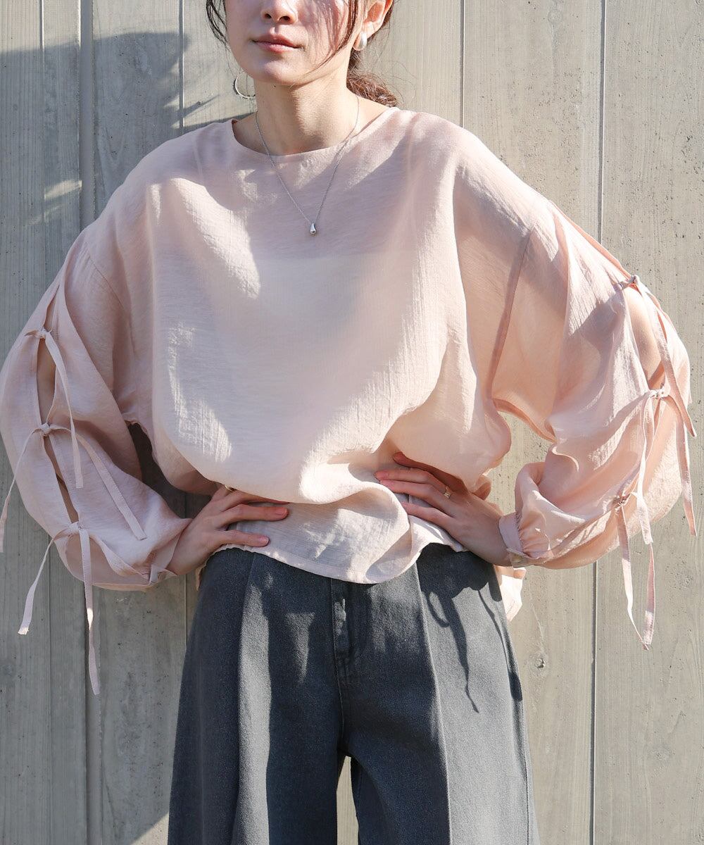袖のスリットにリボンをあしらった、程よいシアー加減が魅力の春らしいブラウスです。光沢のある柔らかい生地が女性らしさを際立たせます。ボディラインを拾わないゆったりめのドロップショルダーで、リラクシーなサイジングも魅力的。タックアウトでお召し頂いても腰までの着丈で安心感があります。落ち着きのあるペールトーンで大人の抜け感スタイルを叶える1枚です。