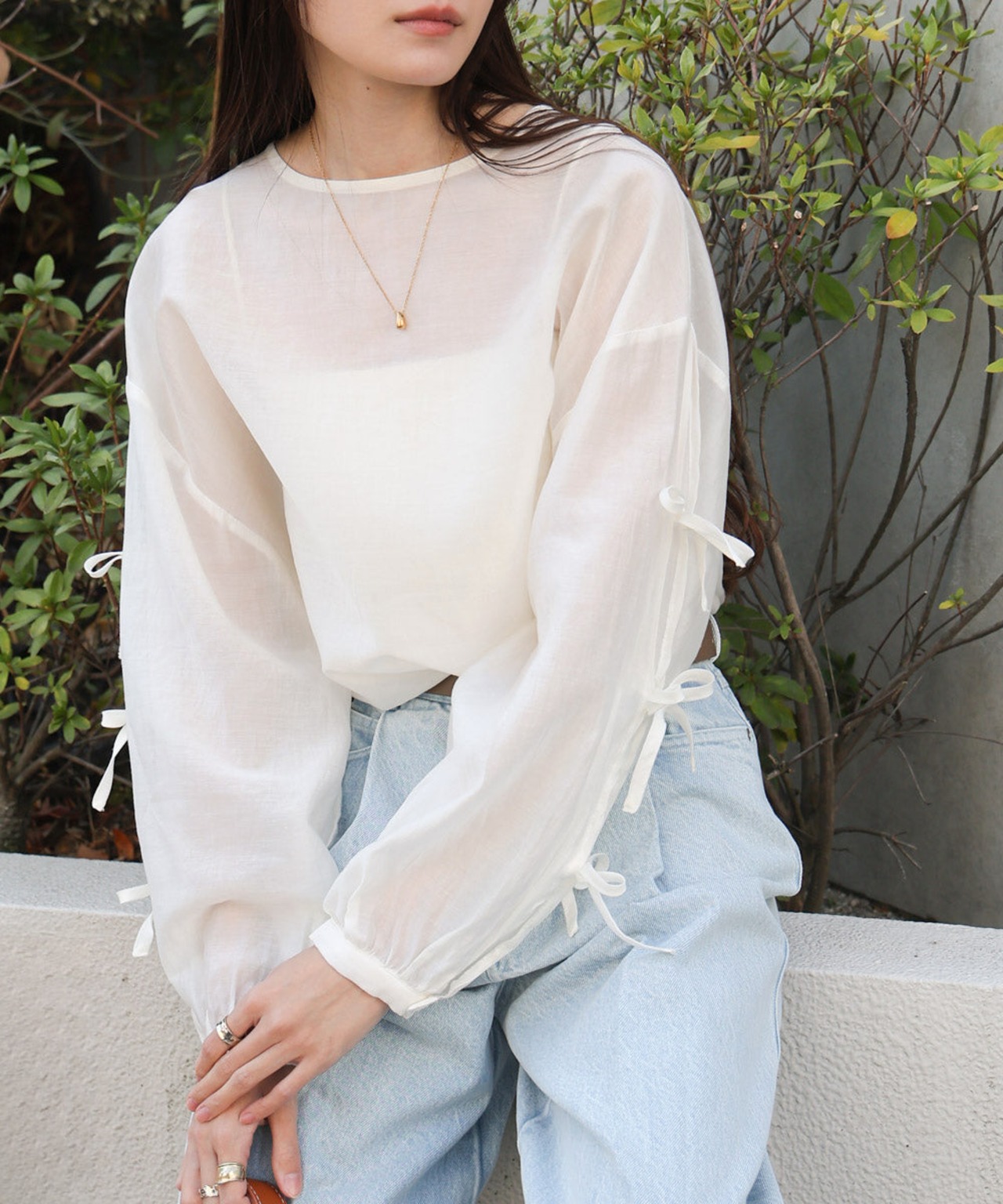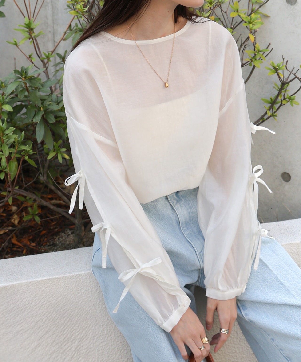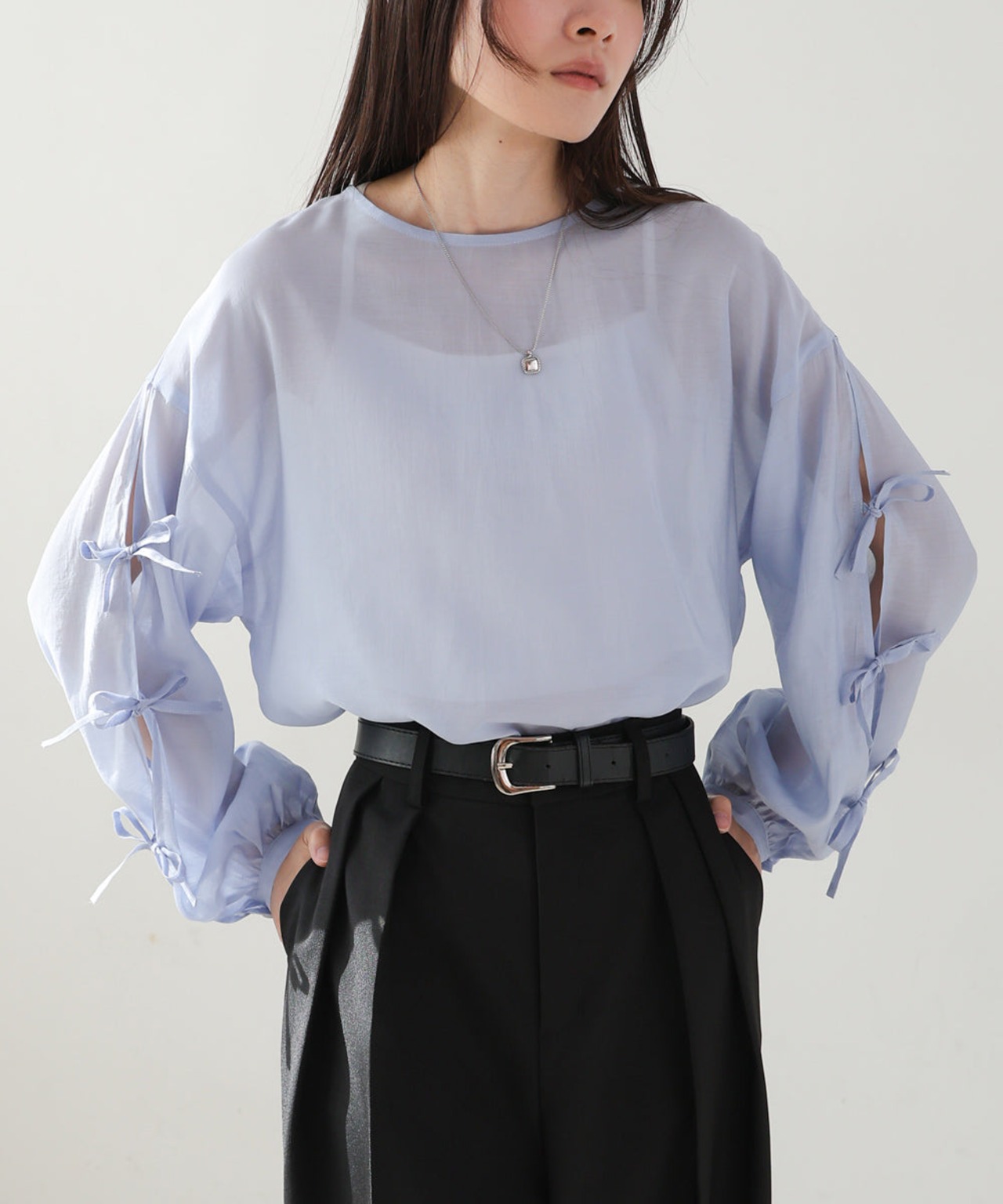 袖のスリットにリボンをあしらった、程よいシアー加減が魅力の春らしいブラウスです。光沢のある柔らかい生地が女性らしさを際立たせます。ボディラインを拾わないゆったりめのドロップショルダーで、リラクシーなサイジングも魅力的。タックアウトでお召し頂いても腰までの着丈で安心感があります。落ち着きのあるペールトーンで大人の抜け感スタイルを叶える1枚です。