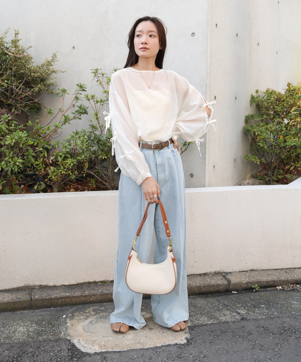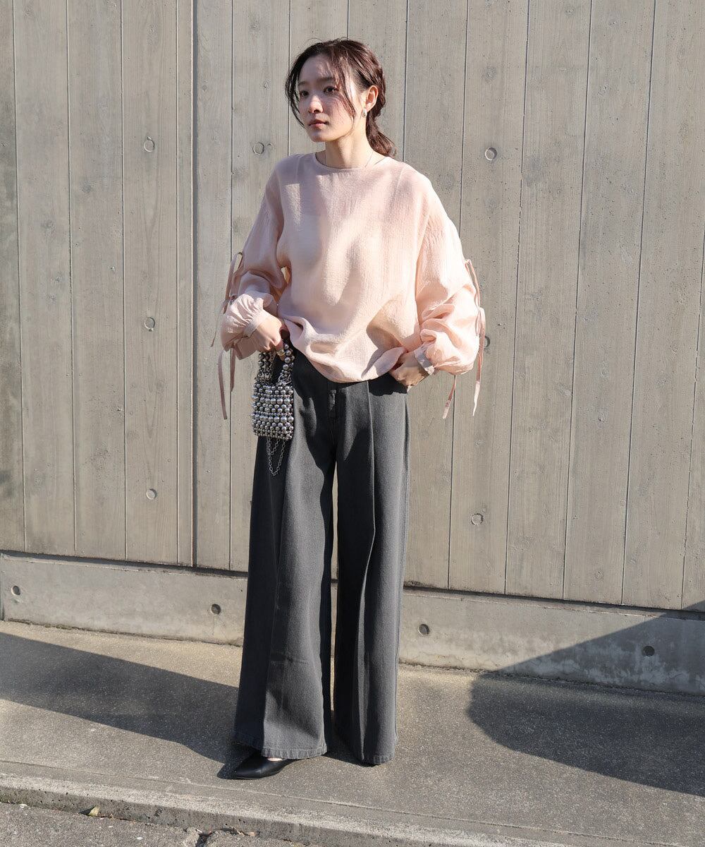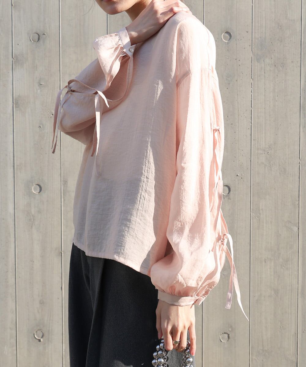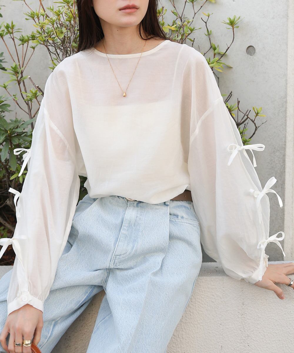 袖のスリットにリボンをあしらった、程よいシアー加減が魅力の春らしいブラウスです。光沢のある柔らかい生地が女性らしさを際立たせます。ボディラインを拾わないゆったりめのドロップショルダーで、リラクシーなサイジングも魅力的。タックアウトでお召し頂いても腰までの着丈で安心感があります。落ち着きのあるペールトーンで大人の抜け感スタイルを叶える1枚です。