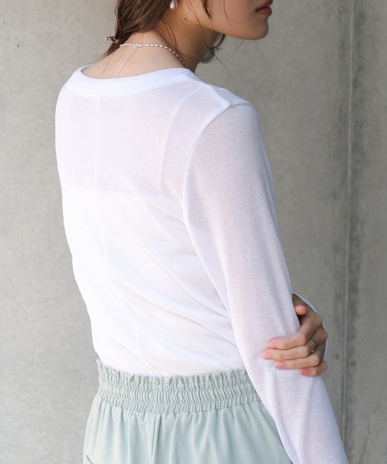 透け感があるので、シンプルに1枚で着る時は重ねるインナーによって色々な表情を楽しめます。