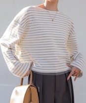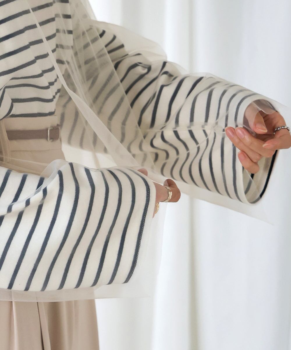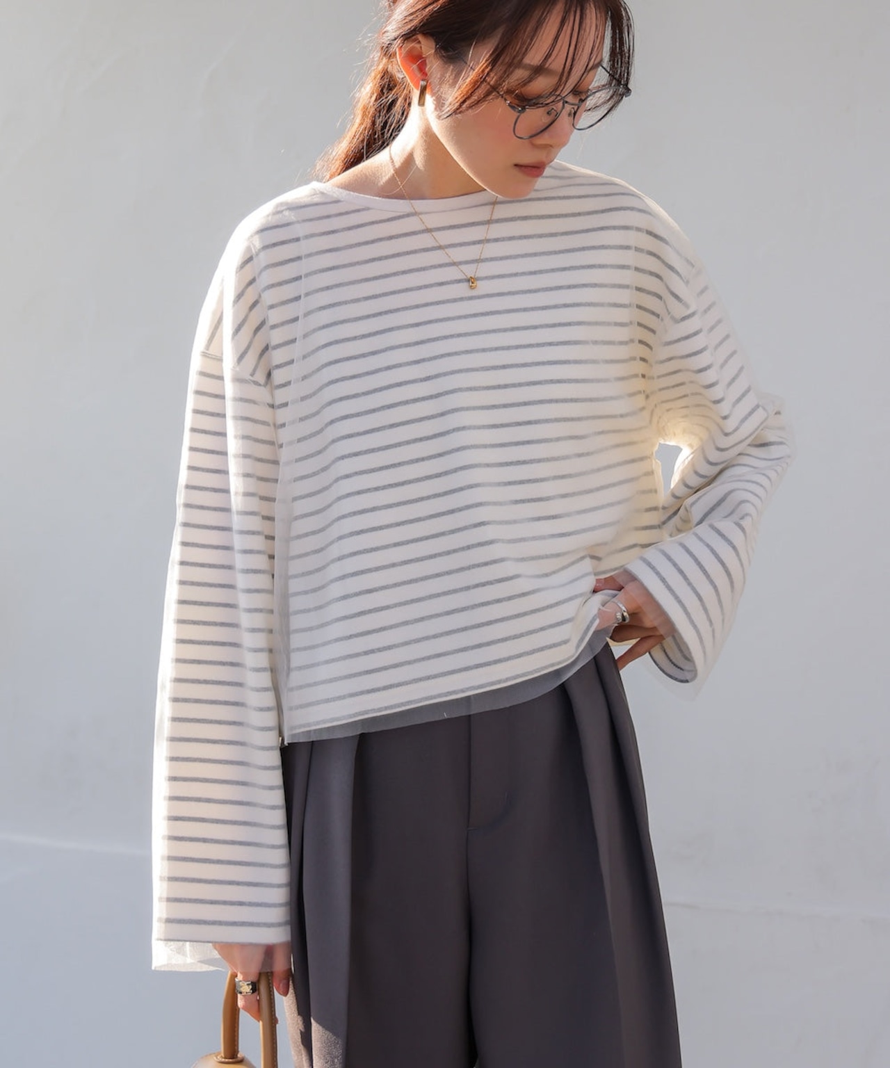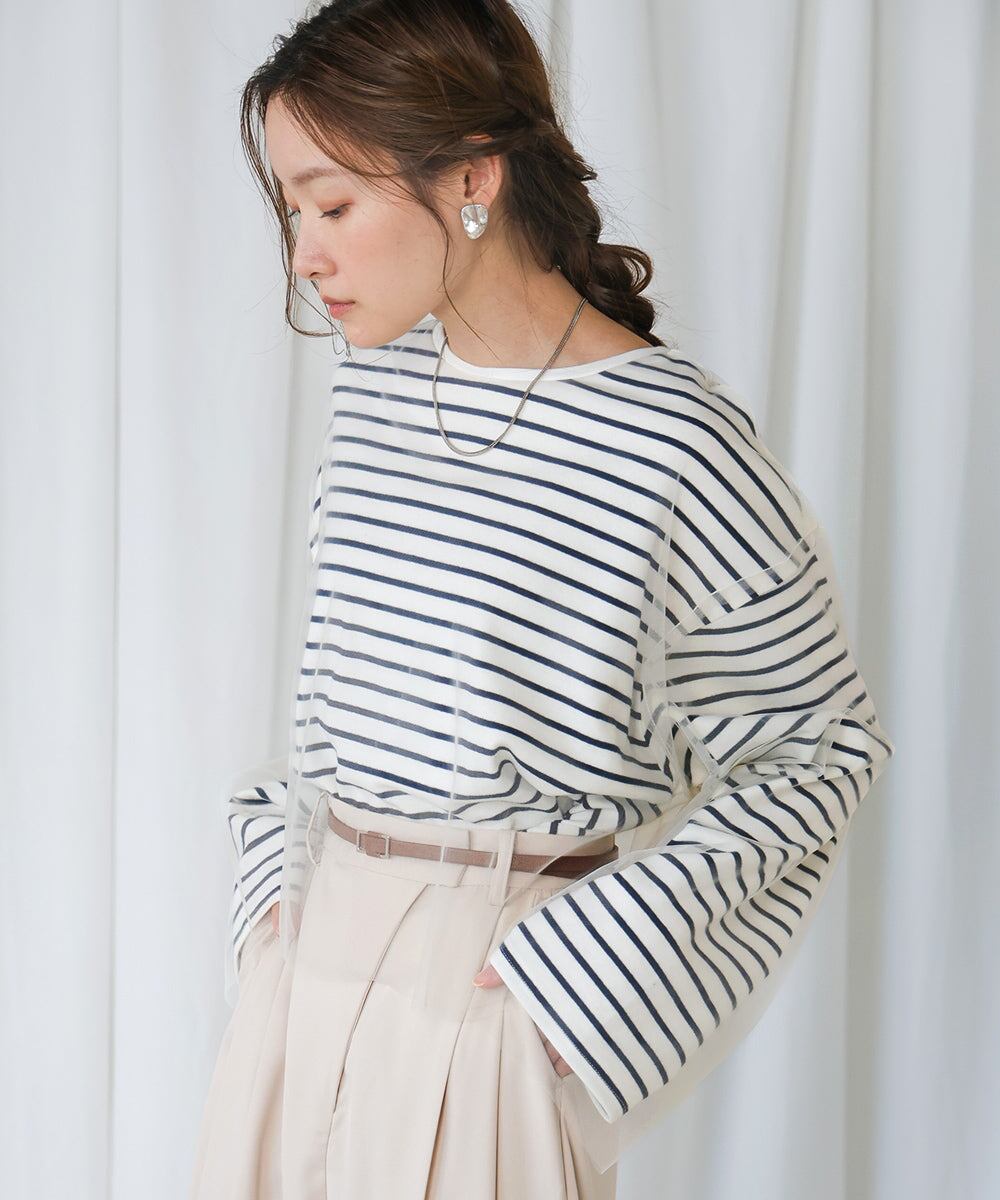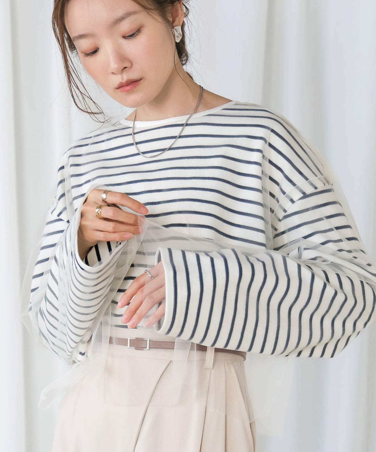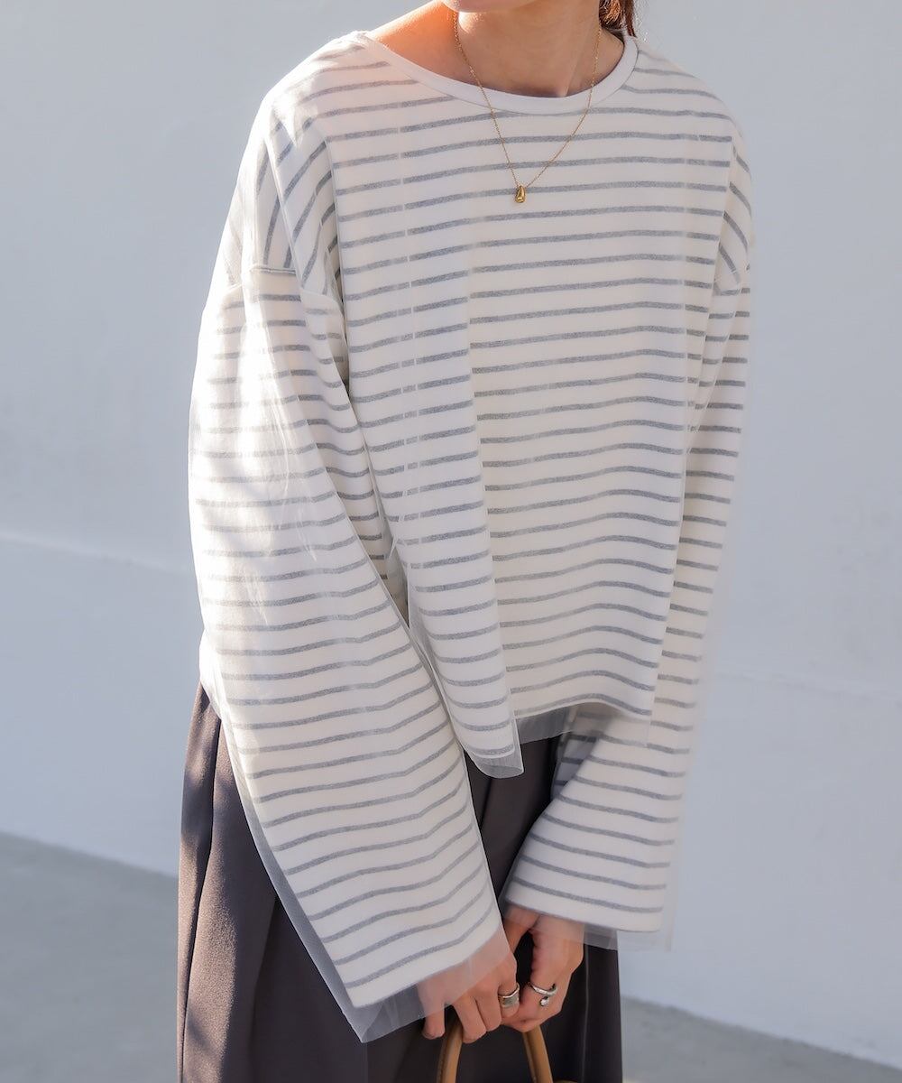 儚げなチュール生地とカジュアルテイストのボーダー柄がミックスした軽い着心地のトップスです。