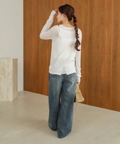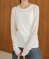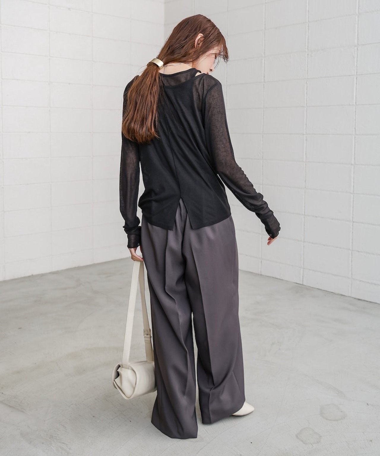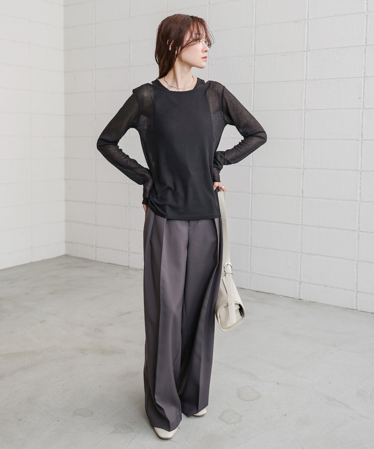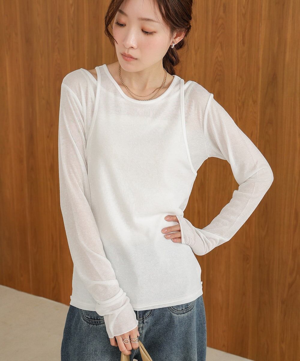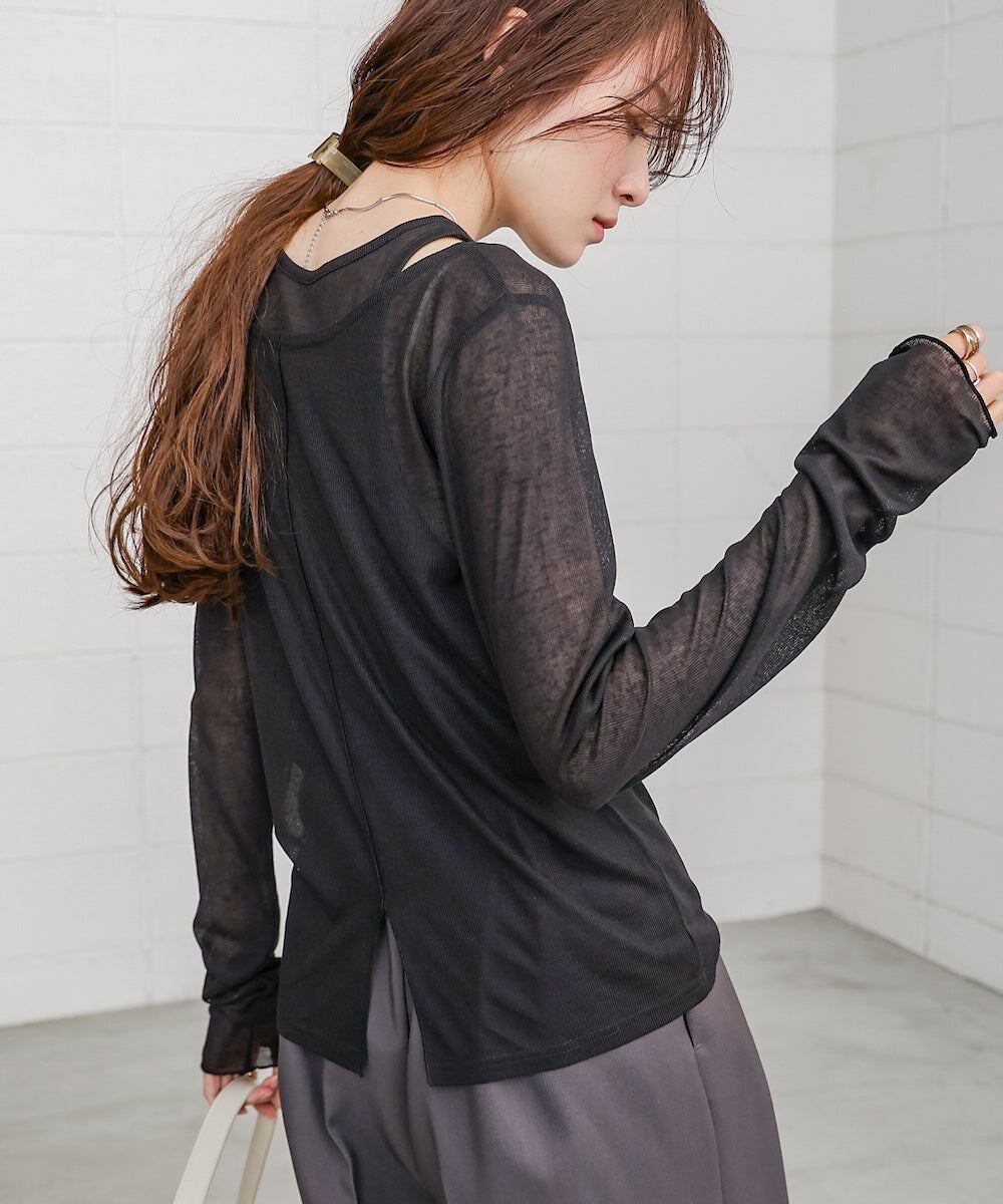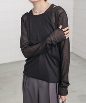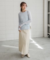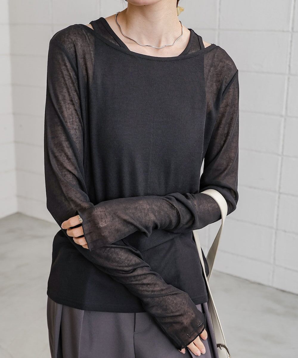 2枚のカットソーがセットになったシアーレイヤードカットソー。レイヤードして着用すると少し肩の部分がスリットのように開くのでトレンディな着こなしが完成します。長袖のカットソーはお袖が長めになっているのでくしゅくしゅして女性らしさをUP!部分的にメロウ始末で仕上げているのでウェーブになった裾などがコーディネートのアクセントになってくれます。衿元が広めに開いたロングスリーブのカットソーと首が少し詰まったタンクトップは1セットあるととても着まわしが効くアイテムです。そしてなんと!長袖カットソーは前後2WAY使用なのでセンターのスリットを前にもってくることも可能。この1セットで何通りもの着方が楽しめるアイテムです!