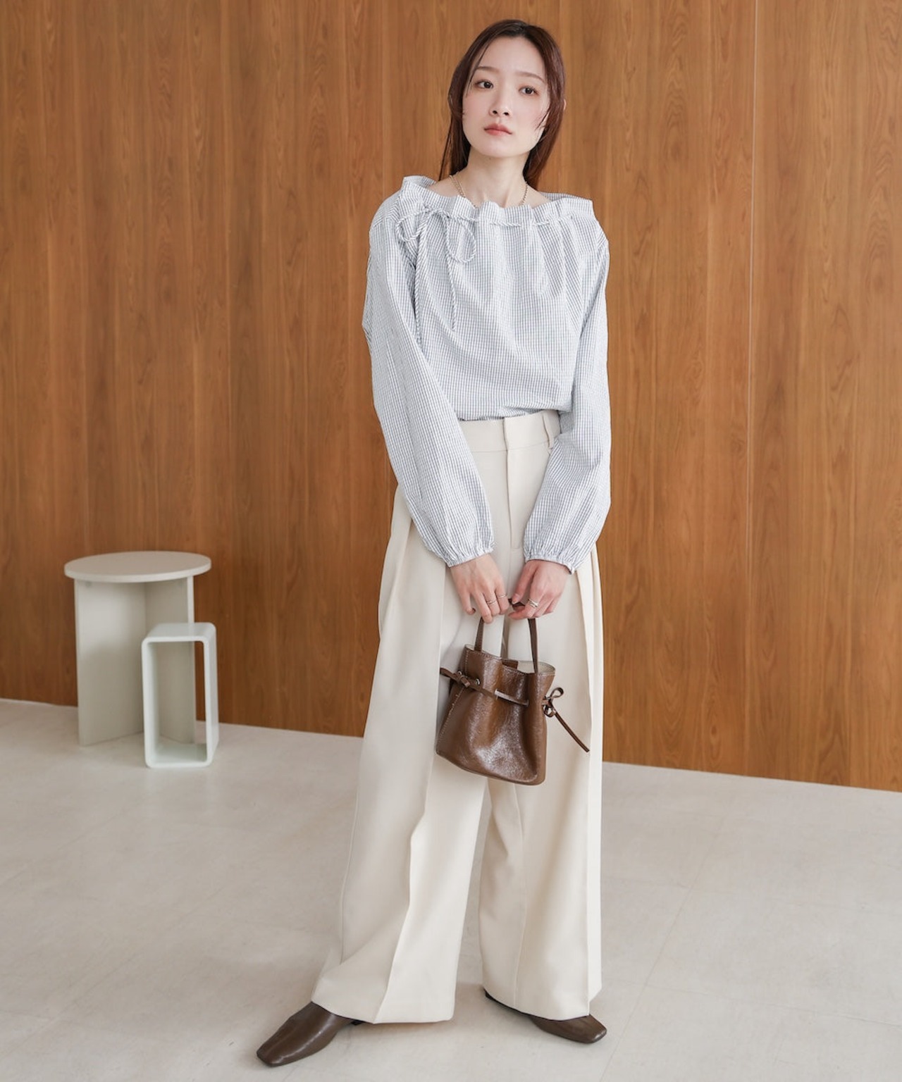 ふんわりブラウスはボリューム感があるため、タックパンツのストレートラインと合わせることで、全体のシルエットにバランスが生まれます。