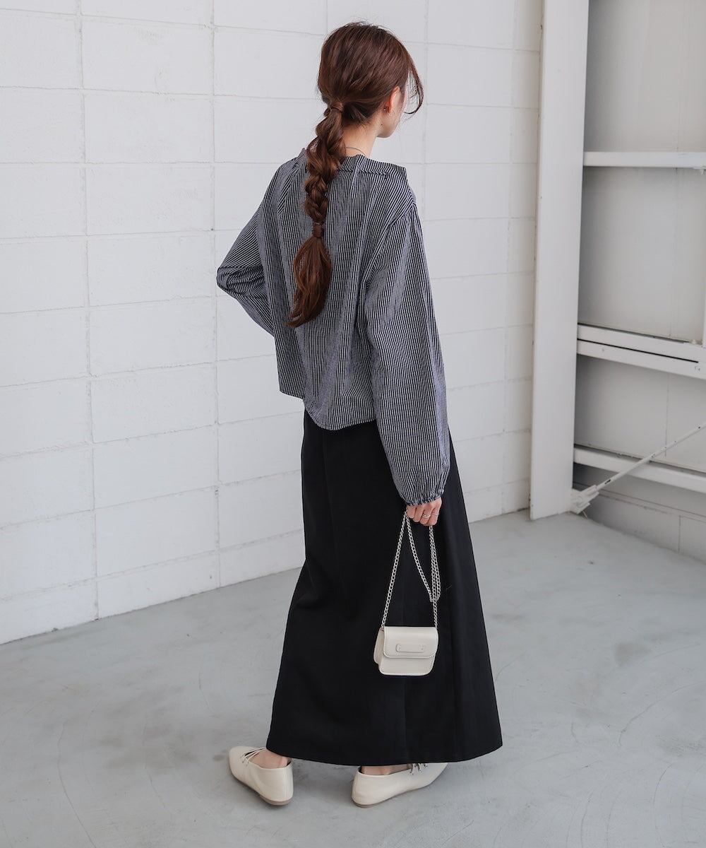 ストライプ柄のブラウスは動きがあり、視線を引き付けます。無地のロングスカートと合わせることで、控えめながらもエレガントな印象を与えるため、全体的にバランスがとれたコーディネートになります。