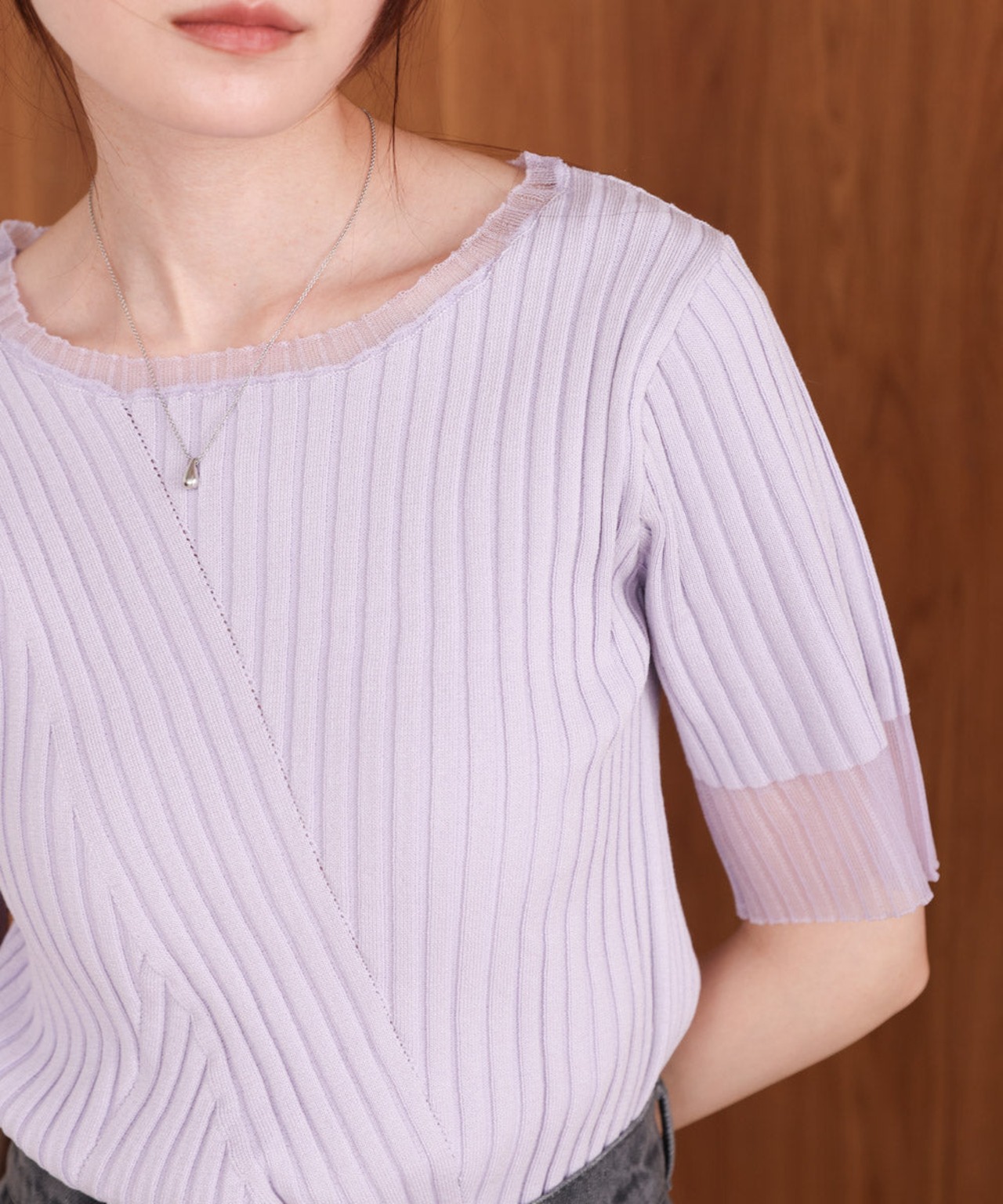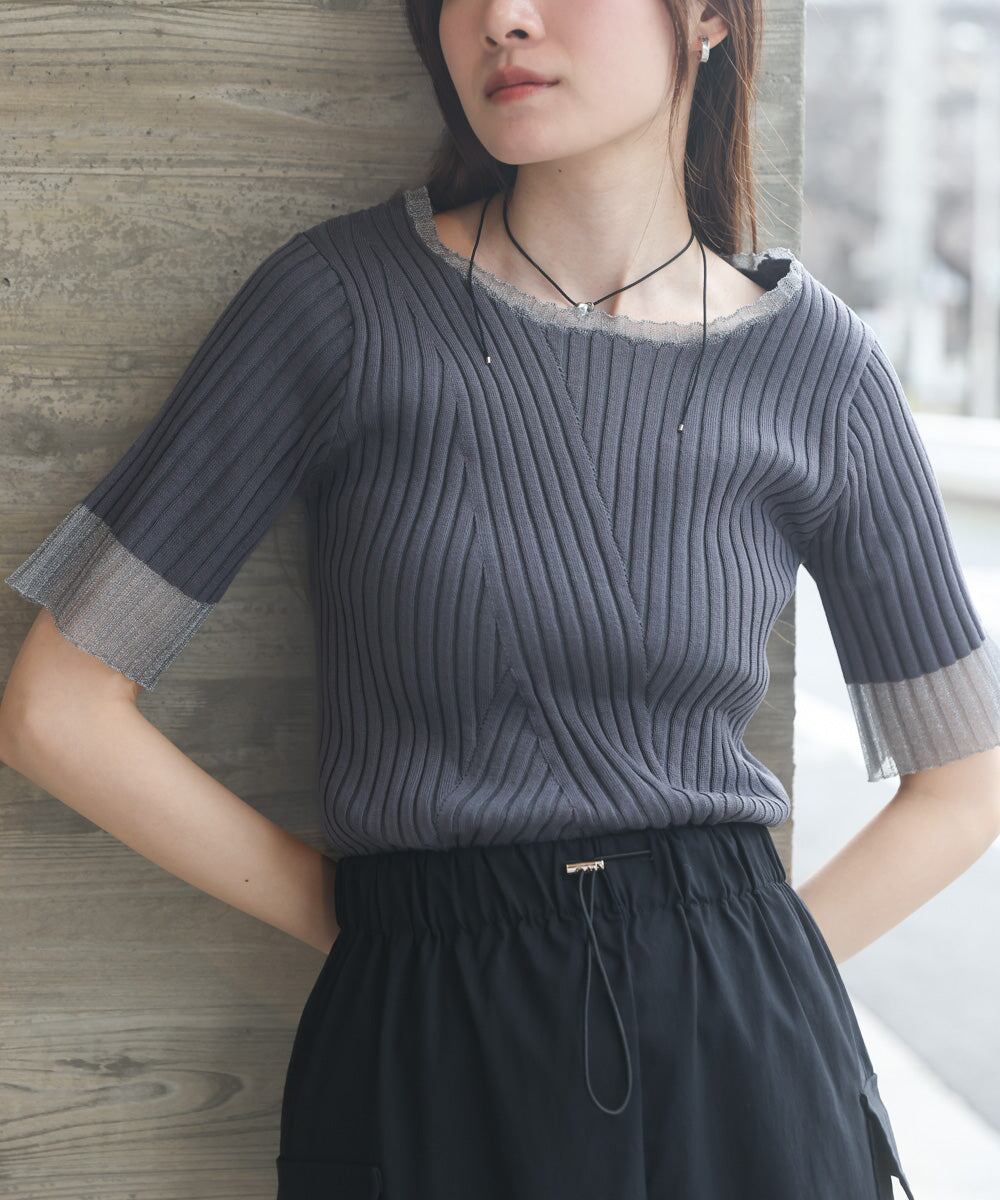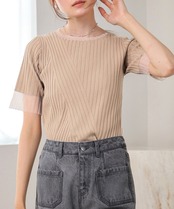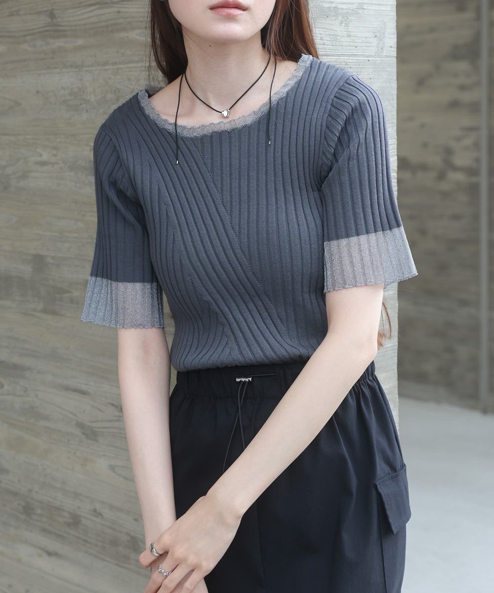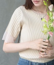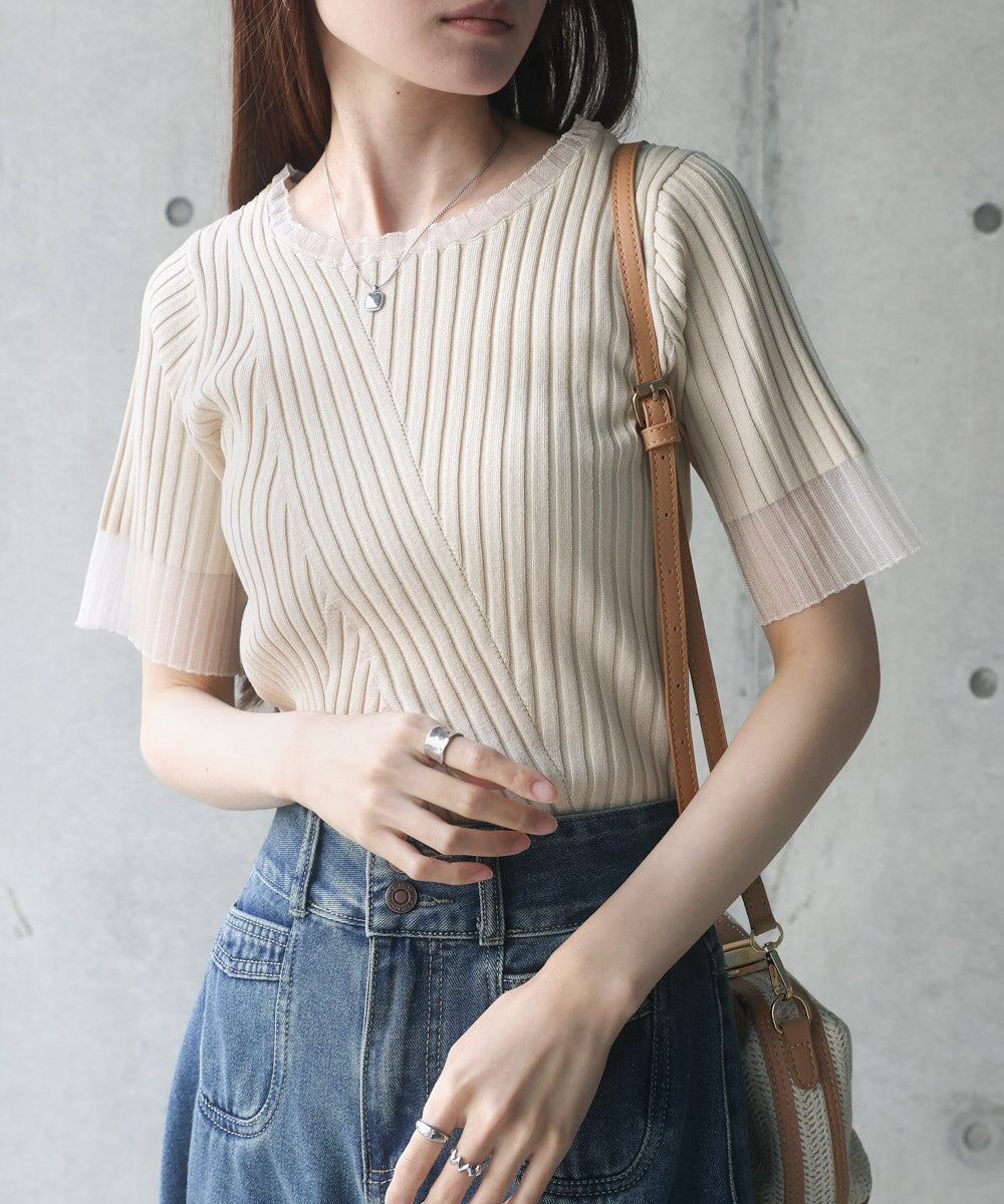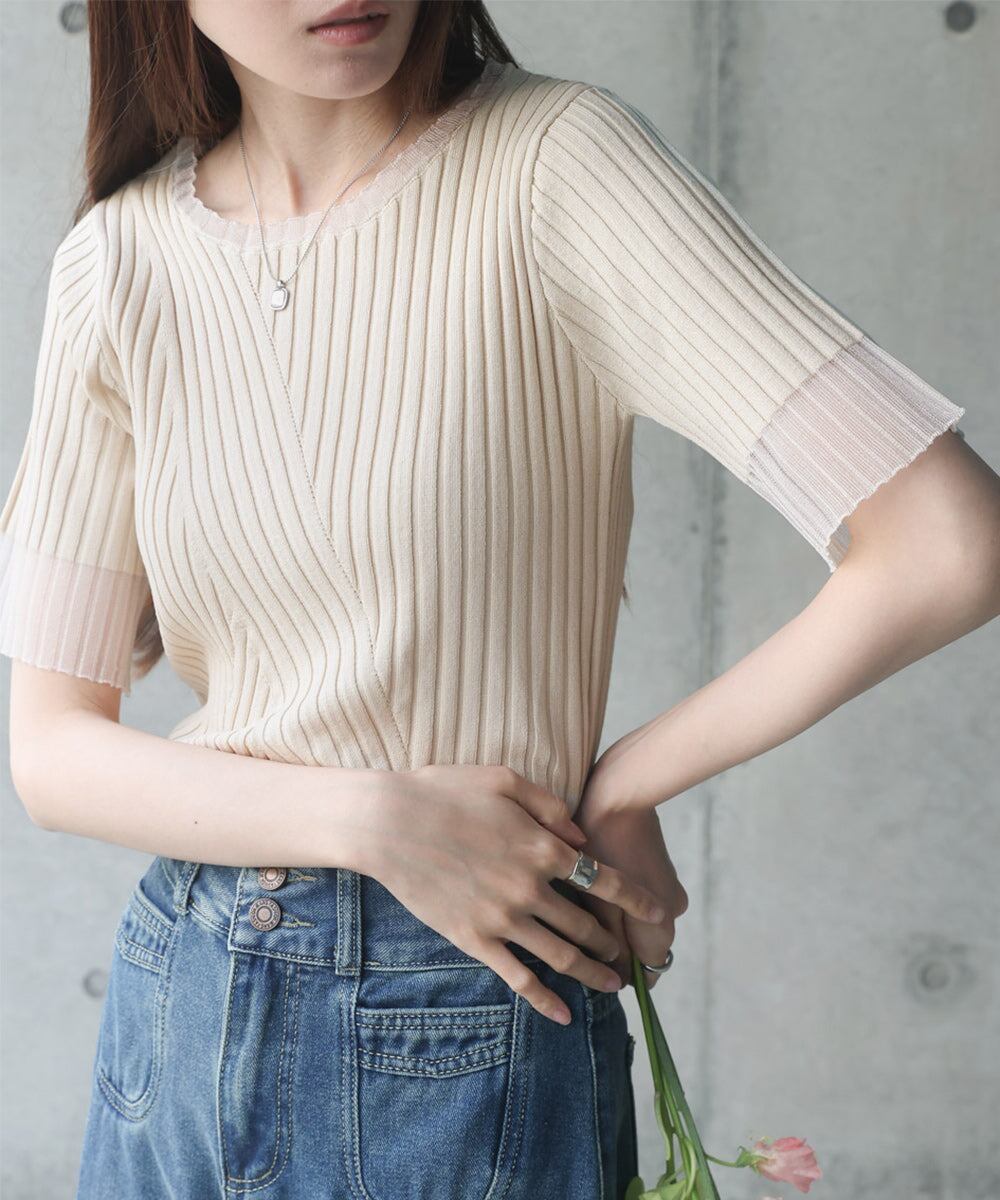 シアー使い5分袖リブニットトップス