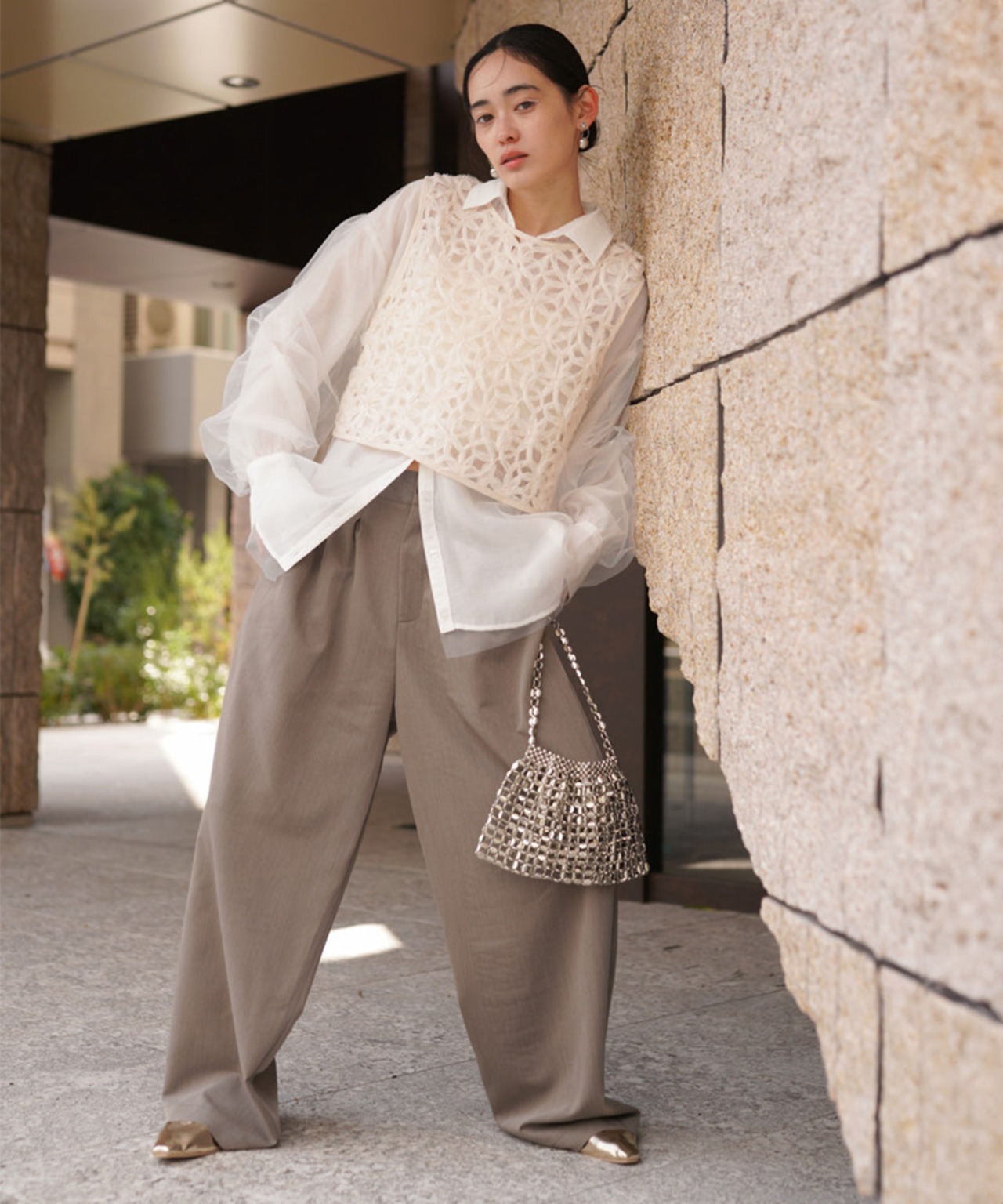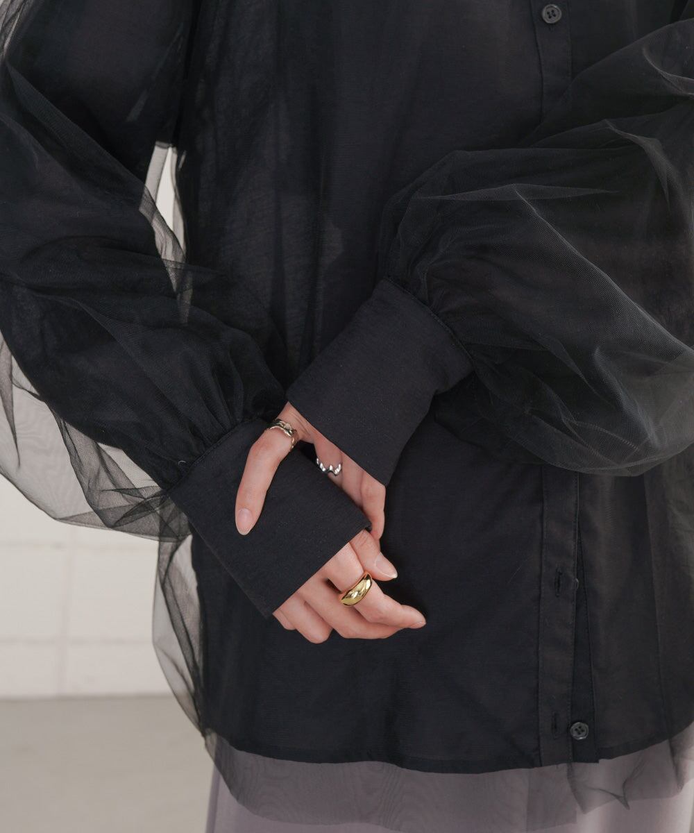 シアー生地にチュールを重ねたクラッシックな雰囲気のシアーシャツ。襟元・袖に入ったギャザーが女性らしく、 お出かけスタイルにぴったりなアイテム。肌やインナーが程よく透けるシアー生地が春夏のコーデにアクセントをつける、シーズンムード高まる1枚です。